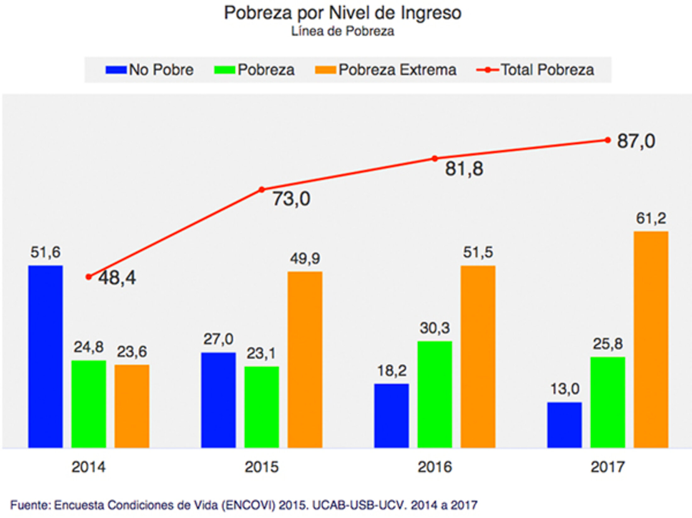 Mme Ponce a expliqué: «Lorsque nous avons lancé l’Encovi en 2014, la pauvreté (entre chronique et extrême) se situait à 48,4% et quatre ans plus tard, en 2017, la pauvreté en tenant compte des revenus (par ménage) était de 87%.»