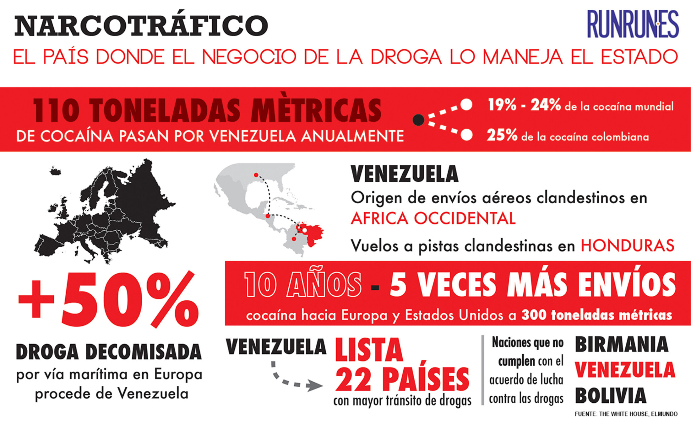 110 tonnes métriques de cocaïne passent par le Venezuela chaque année. Le sous-secrétaire d’État pour l’Anti-Drogue des Etats Unis, William Brownfield déclare que lus de la moitié de la drogue colombienne passe par le Venezuela avant de partir pour l’Europe et l’Afrique. Depuis 2011, le Venezuela est considéré comme le principal pont dans l’itinéraire de la cocaïne.