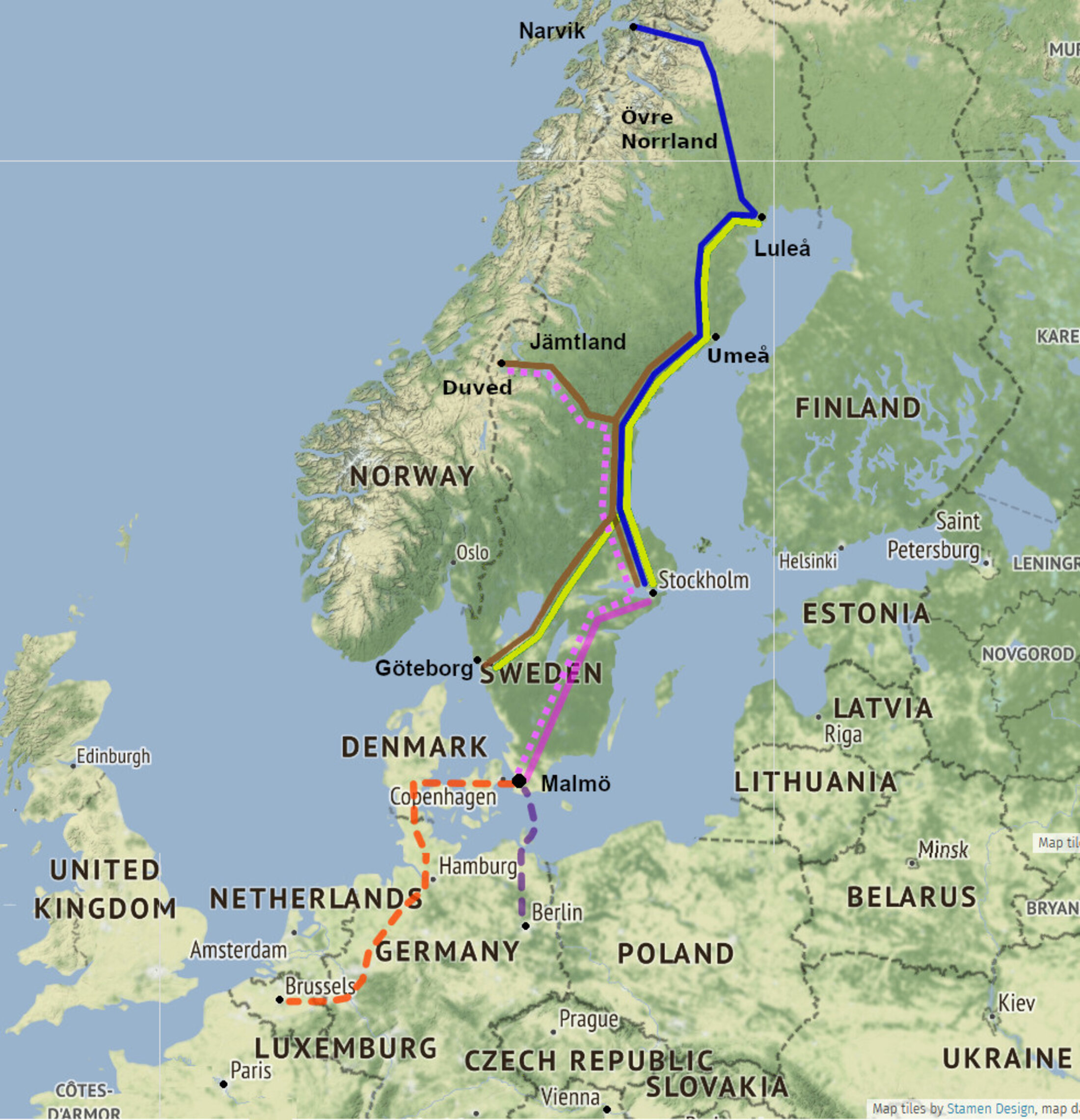 - de Malmö en passant par Stockholm vers les montagnes du Jämtland (1250 km) pour la saison de ski décembre-avril, deux fois par semaine, et ces dernières années de plus en plus aussi pour la saison de randonnée en fin d'été et automne.