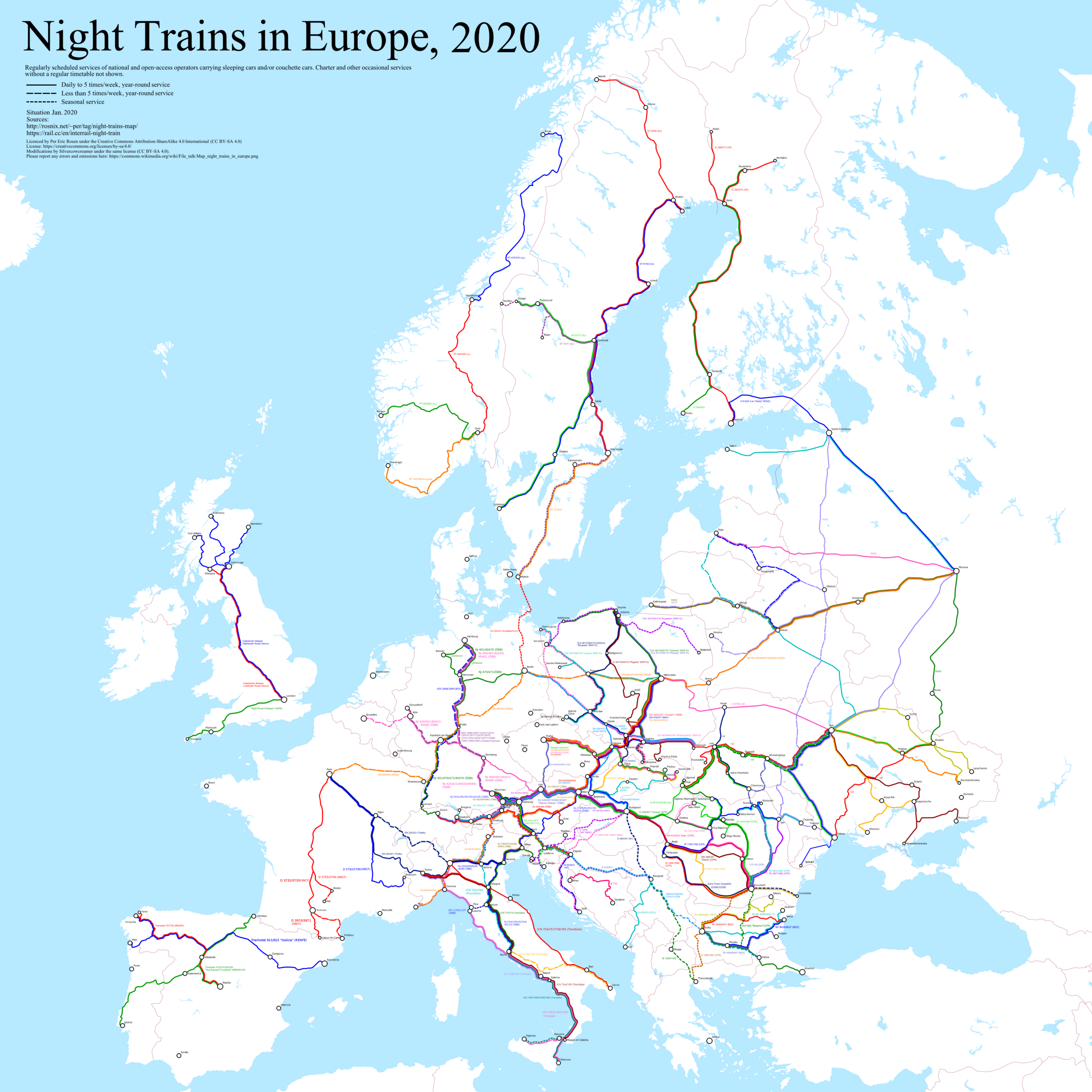 Recourons plutôt à des méthodes éprouvées, en particulier pour les trajets longs : grâce au train de nuit, on peut parcourir des distances d’un millier de kilomètres en saut de nuit, sans dispendieuses lignes nouvelles, en empruntant le réseau existant qui, fort heureusement, reste dense en Europe. Là où il existe déjà des tronçons plus rapides, le rayon d’action du train de nuit peut même nettement dépasser les 1 000 km, sans que le trajet ne paraisse long, puisqu’on le passe à dormir, contrairement aux parcours effectués de jour, même à grande vitesse : même à 350 km/h, un voyage diurne à travers l’Europe paraîtra très long à la plupart des voyageurs [NdT : 12 heures de Lisbonne à Helsinki pour un train à 350 km/h sans arrêt sur plus de 4000 km]. A contrario, quoi de plus agréable que de se réveiller à l’heure du petit déjeuner, après une bonne nuit de sommeil, dans une autre ville ? Le train de nuit prend ici l’avantage sur l’avion, qui nous oblige, pour le même résultat, à nous lever avant l’aube.