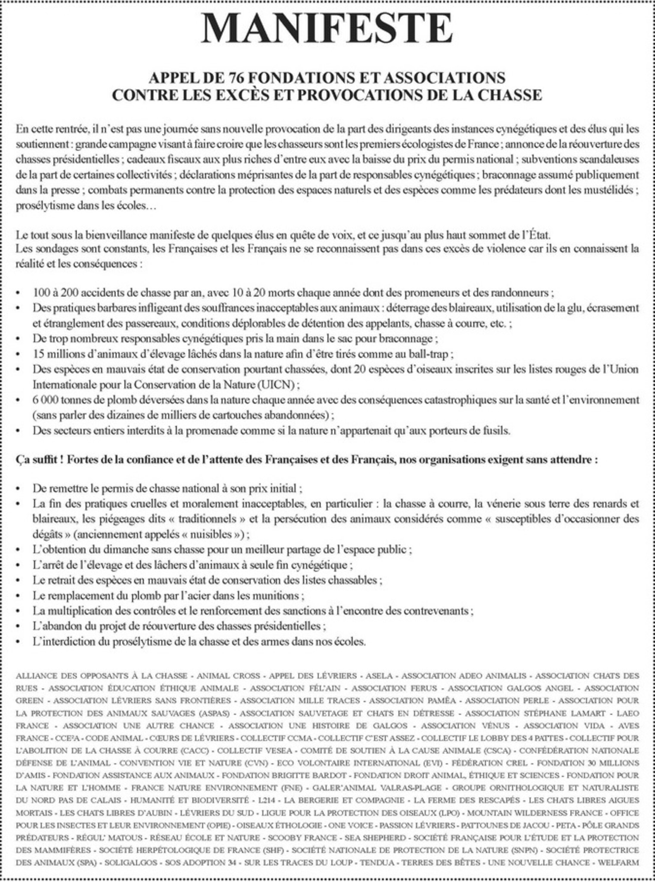Parmi les 76 fondations et associations (LIRE aussi le manifeste complet à la fin de l’article) figurent les plus virulents défenseurs des animaux : la Fondation Brigitte Bardot, la Ligue pour la protection des oiseaux, la Fondation 30 millions d'amis, L214 Éthique & Animaux, Peta, One Voice, la Ligue de protection des animaux sauvage (l'Aspas) ou autre SPA... Qui dénoncent d’une même voix « 100 à 200 accidents de chasse par an, avec 10 à 20 morts chaque année, dont des promeneurs et des randonneurs », et « des pratiques barbares infligeant des souffrances inacceptables aux animaux : déterrage des blaireaux, utilisation de la glu pour des oiseaux, écrasement et étranglement des passereaux, chasse à courre, etc. ». Les signataires « exigent sans attendre la fin de la chasse à courre, de la vénerie sous terre des renards et blaireaux, des piégeages dits "traditionnels" et de la persécution des animaux dits nuisibles ». Et plaident de nouveau pour le dimanche sans chasse dans un meilleur partage de l’espace public. Ce dernier point vient d’ailleurs d’être rejeté par François de Rugy, ministre de la Transition écologique et solidaire, qui a appelé lundi 29 octobre 2018 les chasseurs, face aux accidents de chasse répétés, à une « généralisation de bonnes pratiques » (VISIONNER la vidéo suivante).