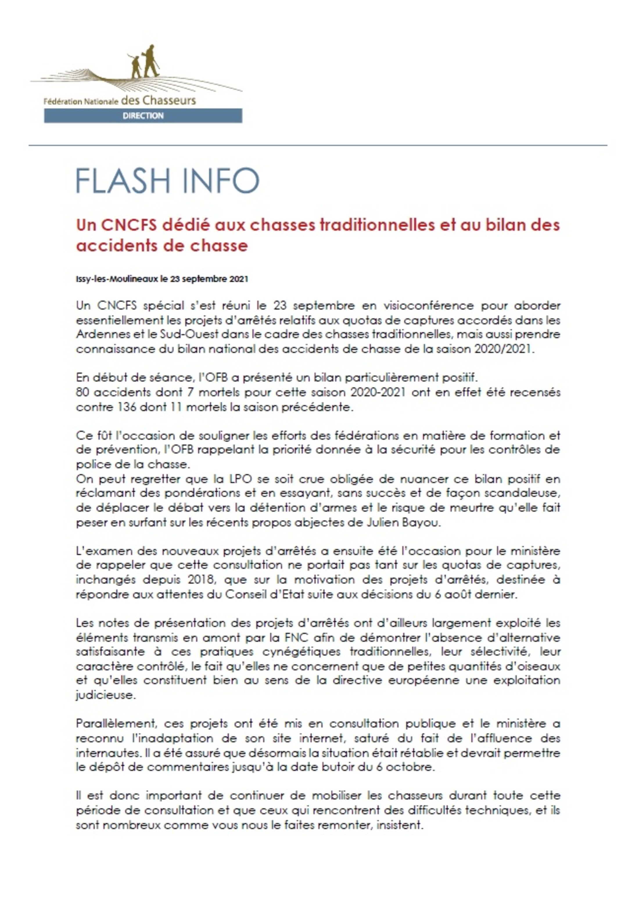 Plus troublant encore, non seulement l’Office français de la Biodiversité n’a toujours pas communiqué au public la synthèse des accidents et incidents de chasse 2020-2021 (refusé notamment au journal "le Monde" du 16 novembre 2021), mais le 23 septembre dernier, l’OFB les auraient fournis aux chasseurs, en présence de Willy Schraen, lors d’un Conseil national de la Chasse et de Faune sauvage (CNCFS), dédié aux chasses traditionnelles et … aux accidents de chasses (COMMUNIQUÉ DE LA FÉDÉRATION DES CHASSEURS CI-DESSOUS). Ah bon ? Les chasseurs informés et pas les Français(e)s, aussi concerné(e)s ? Les chasseurs avancent même des chiffres « OFB », lors de ce conseil de CNCFS, de 80 blessés et de sept morts pour 2020-2021, bilan que des chasseurs brandissent depuis comme une « baisse historique », sans d’ailleurs se remémorer le plus récent « non-chasseur » tué en décembre 2020, et pris pour un sanglier à la porte de chez lui : Morgan Keane, 25 ans. Et en passant sous silence que ce bilan d'accidents de chasse 2020-2021 peut être considéré comme "discutable" sur ses "bons" résultats présentés comme "en baisse", car la chasse cette saison-là a aussi été limitée à cause du confinement en raison de la pandémie de COVID 19 ?