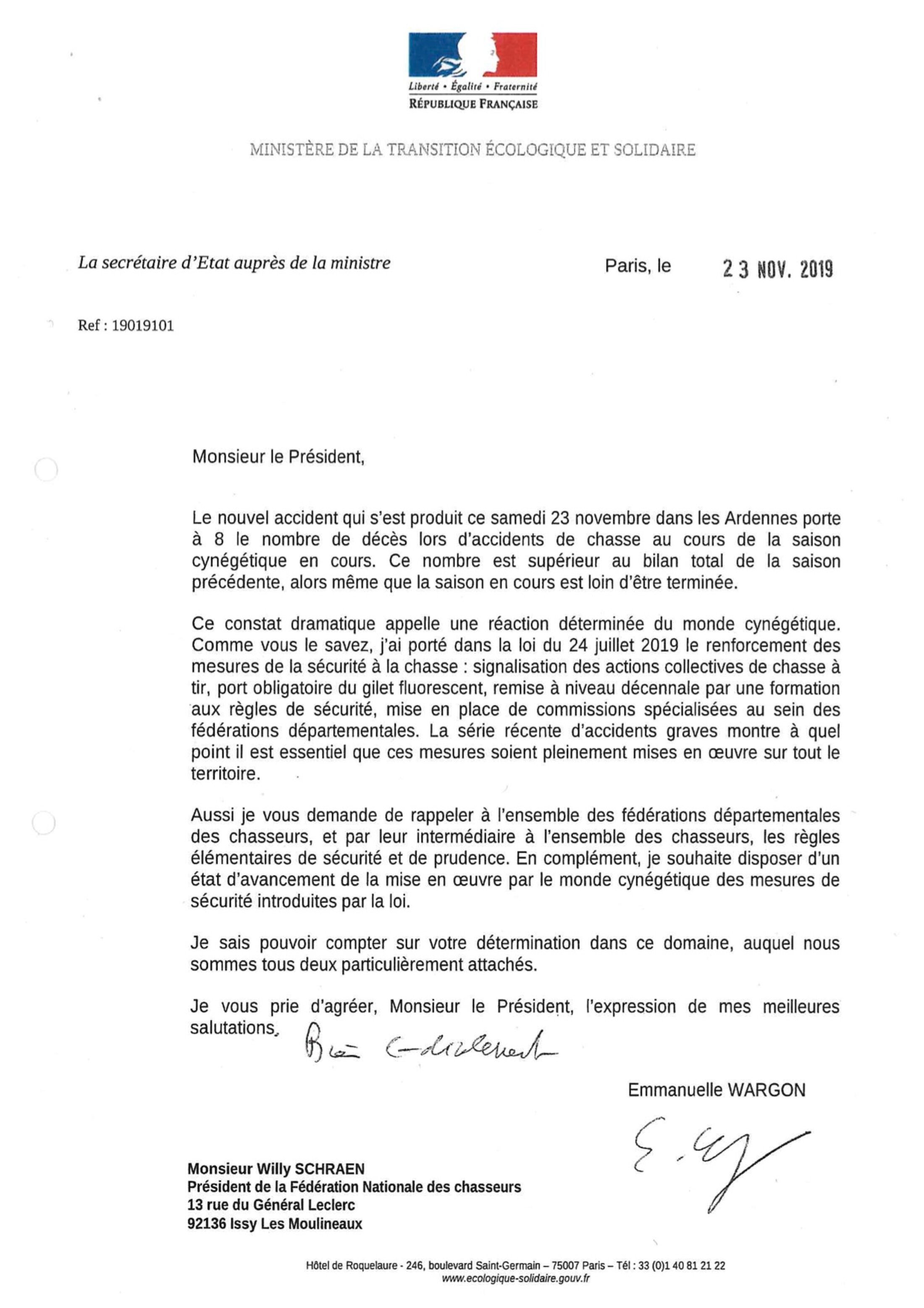 Les accidents récurrents de chasse et les tirs accidentels de chasseurs, de plus en plus impopulaires auprès des Français, deviendraient-ils alors une « épine dans le pied » de l’Office français de la Biodiversité (OFB) qui n’a pas rendu publics les tirs accidentels de chasseurs de l’année passée (2020-2021), comme chaque début d’été jusqu’en 2020 ? Cela fait un mois que l’ouverture générale de la chasse « saison 2021-2022 » a débuté (et le recensement de nouveaux accidents avec), et l’OFB reste toujours silencieux sur les accidents de chasseurs 2020-2021… Les tirs accidentels de chasseurs et autres balles perdues sur des riverains sont-ils devenus tabous à l'OFB, service public qui chaque année tenait les Français(e)s au courant des accidents de chasse de l'année passée ? La dernière information de l’OFB à ce sujet date du 17 juillet 2020, et concernait les tirs accidentels de chasse 2019-2020, saison « record » s’il en est, puisque 2019-2020 a été plus accidentogène, avec 141 victimes contre 131 en 2018-2019. Et en 2019-2020, 11 accidents mortels ont eu lieu contre 7 morts durant la saison précédente (LIRE ICI PLUS EN DÉTAIL). Emmanuelle Wargon, alors secrétaire d’État auprès de la ministre de la Transition écologique et solidaire, s’était même fendue d’une lettre rendue publique à Willy Schraen, le 23 novembre 2019, pour mettre en garde et demander des comptes au patron des chasseurs (LETTRE CI-DESSOUS)…