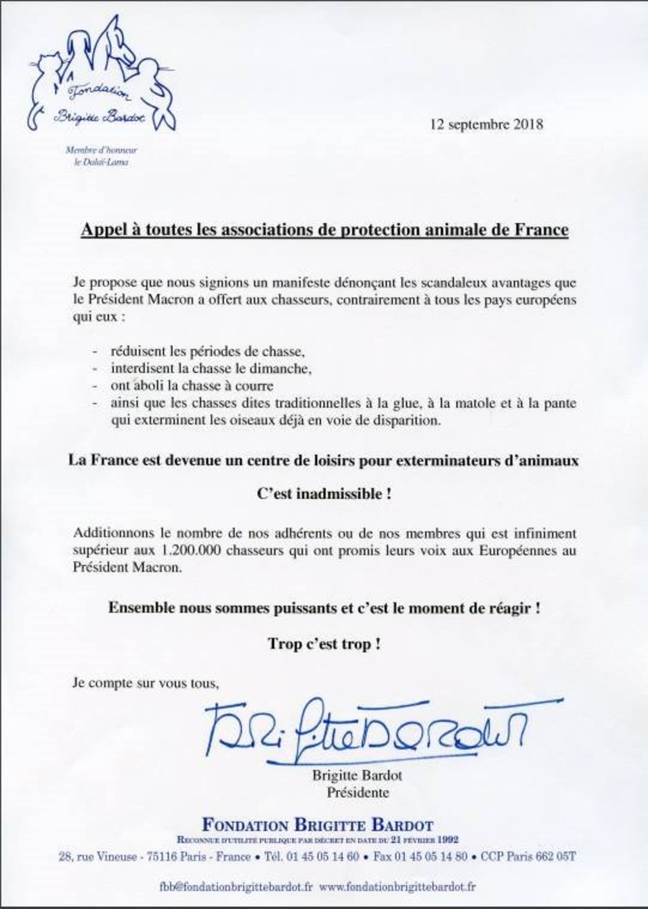 Il suffit de lire l’appel par Brigitte Bardot à toutes les associations de protection animale de France, le 12 septembre 2018, pour prendre la mesure de la détermination des Français(e)s dans la prise en compte de leurs doléances en la matière. Français(e)s qui ne sont pas loin de brandir leurs bulletins de vote, telles des pancartes, pour faire entendre leur « voix »… Et si la colère de Mme Bardot, symbole de la défense des animaux s’il en est, cible dans sa lettre des points plus névralgiques de la chasse en général, on sent bien que la cause animale est devenue une vraie préoccupation sociétale. La sphère politique, droite et gauche confondues, aurait tort aujourd’hui de le sous-estimer…