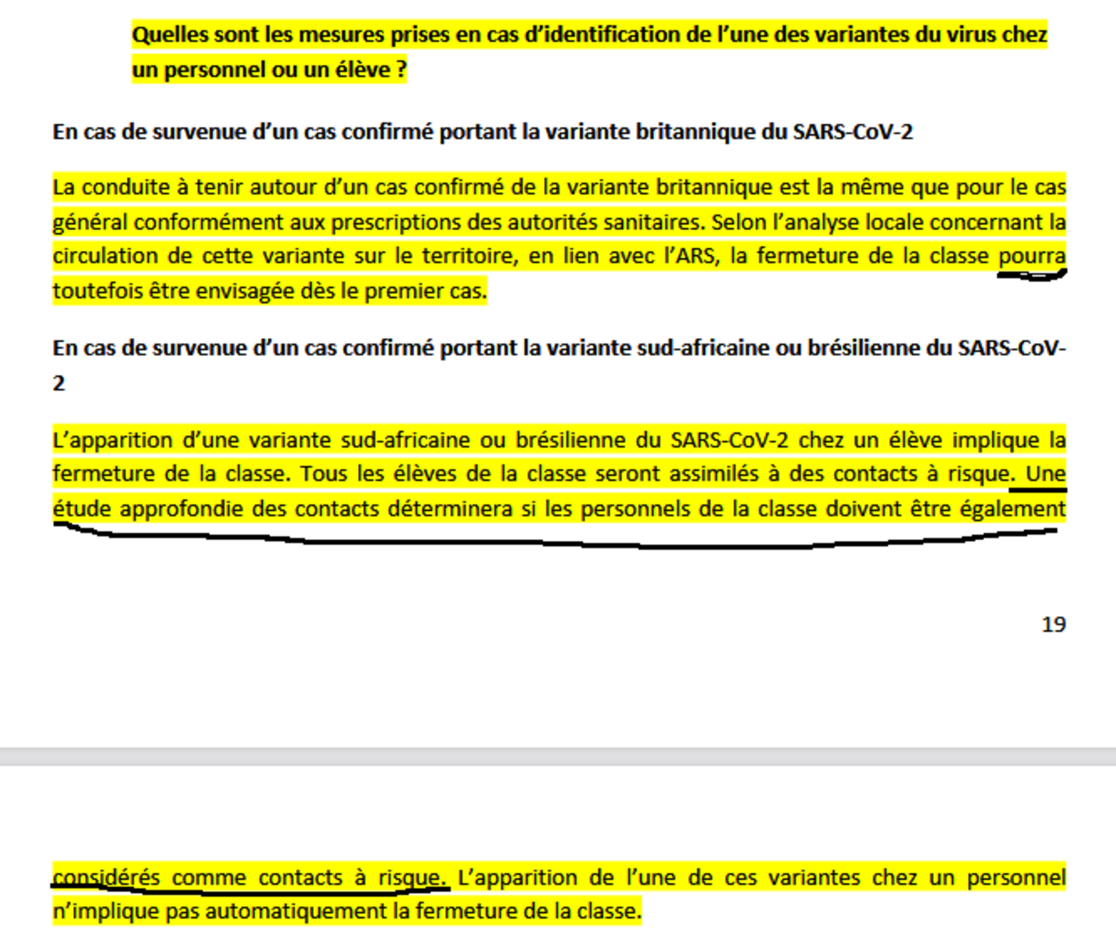 soit une hausse de 1606 cas en 24h et 217 personnels en 24h ( alors que la zone A est en vacances et que ces données ne concernent donc que les zones B et C), le Ministère publie un rectificatif dans sa foire aux questions dont il souligne lui-même en jaune les modifications. Alors que depuis peu, tout cas de Covid-variant anglais amenait immédiatement la fermeture de la classe et l'éviction des enseignants, voilà ce que l'on peut lire.