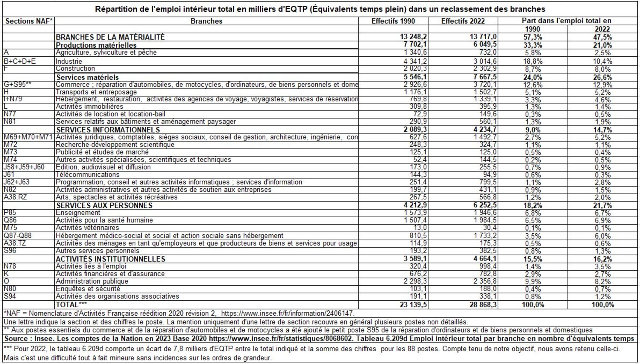 Avec des limites tenant à la source utilisée et aux choix en partie arbitraires que j'ai dû effectuer, le tableau 1 propose un éclairage venant de la répartition de l'emploi en France dans un reclassement des branches s'inspirant des distinctions ci-dessus. Il y ajoute les branches de l'institutionnel qui s'attachent aux rapports sociaux dans lesquelles les activités et l'ensemble de la vie s'effectuent. Il fait ressortir que, sur la période 1990-2022, les branches de la matérialité demeurent de loin les principales, avec cependant une décroissance de leur part de 57,3 % à 47,5 % de l’emploi en EQTP (Équivalents temps plein) et, du fait de la désindustrialisation de l’économie française, des mouvements en sens inverse des branches des productions matérielles perdant 12,3 points et des services matériels en gagnant 2,6. Les branches de l'informationnel et des services aux personnes croissent et passent respectivement de 9,0 % à 14,7 % et de 18,2 % à 21,7 %. Les branches de l'institutionnel sont presque stables passant de 15,5 % à 16,2 %. Le travail vivant informationnel a donc des résultats relevant d'abord des branches de la matérialité et de leurs formes marchandes de validation sociale. Ce constat n'empêche pas de souligner l'importance dans la division du travail de l'autonomisation largement marchande des branches de l'informationnel et la part des services aux personnes que nous proposons de faire croître dans des formes non marchandes de validation sociale avec transfert de plusieurs points de PIB[22], de pair avec l'importance majeure qui demeure de la transformation des rapports de production de la matérialité en y joignant maintenant les services informationnels.