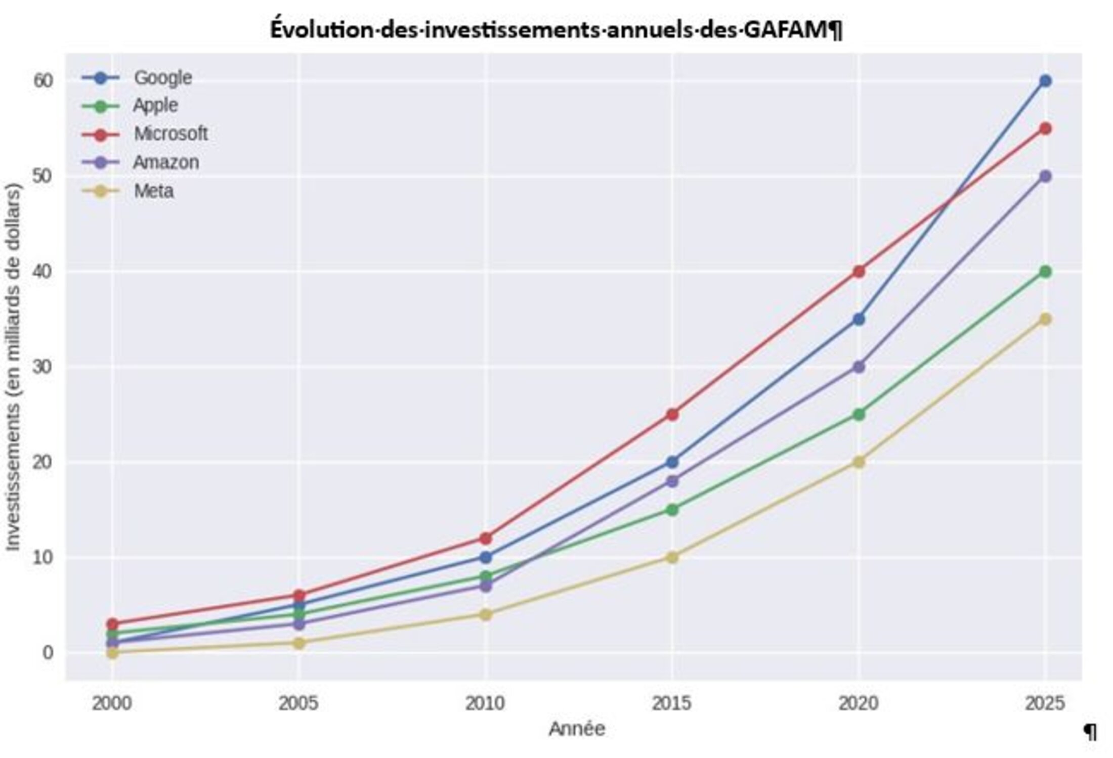 Pour conforter leurs positions dans la production et l'usage des informations et renouveler ainsi leurs rentes, les GAFAM effectuent des investissements de grande ampleur. Sur ces investissements, pour illustrer par défi le fait qu'ils peuvent conduire à des progrès des connaissances, je me référerai à un graphique que j'ai demandé à Copilot-Microsoft de dessiner et que voici sous toutes réserves, car je n’ai pas effectué un retour aux sources :