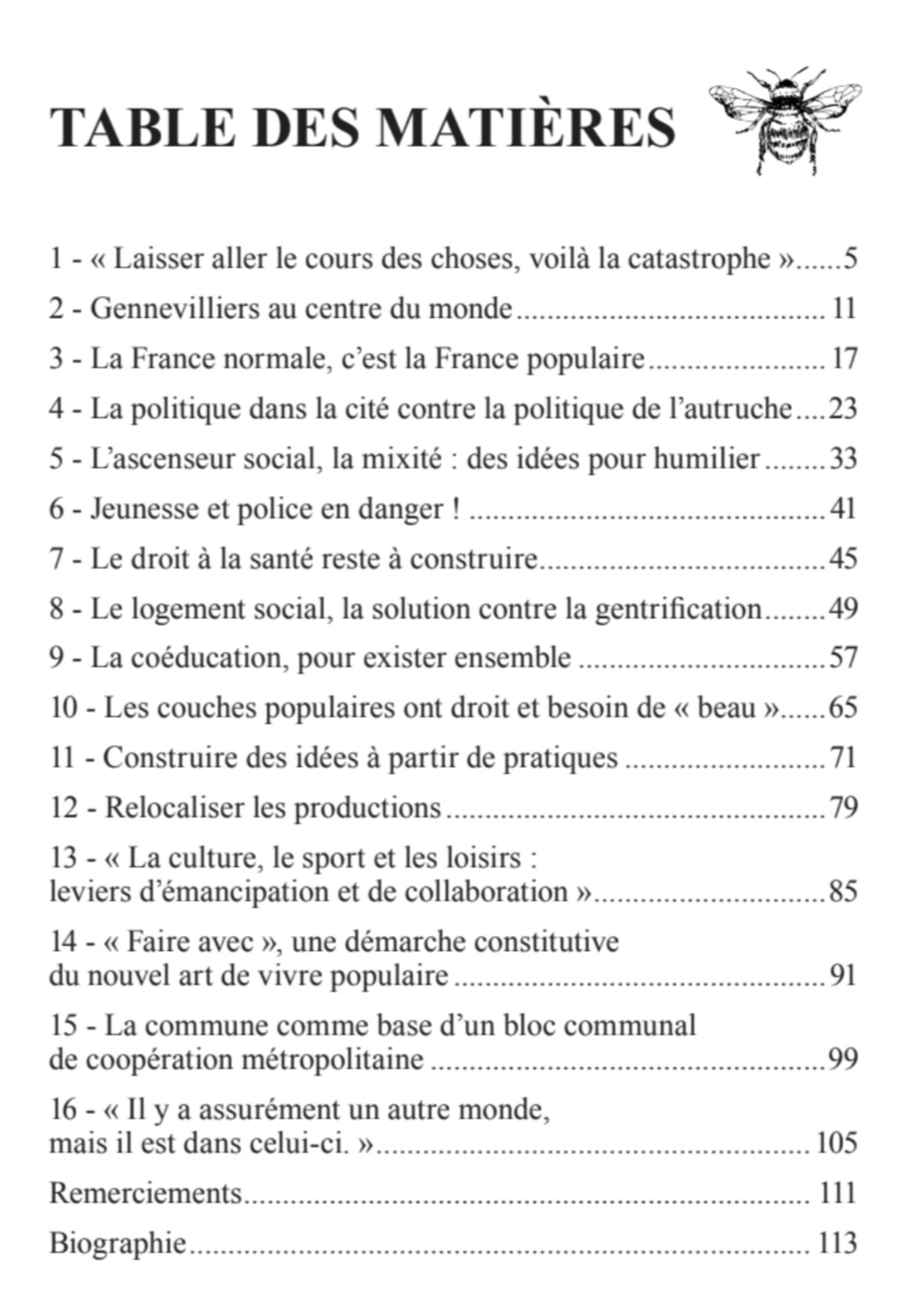 Ce livre tente de contribuer, modestement mais assurément, à ce débat citoyen, à partir de mon expérience de maire d’une ville populaire, de maire qui veut participer à changer le système, dépasser le système capitaliste en un nouvel écosystème respectueux de l’environnement et des êtres humains. »