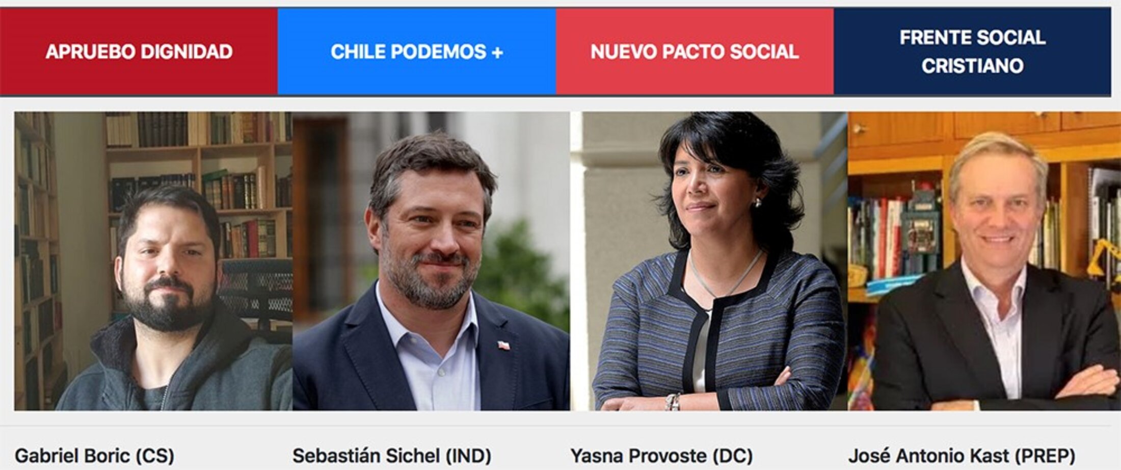 Voici les candidats officiels à la présidence avec entre parenthèses les intentions de vote tels que données, le 4 novembre, par l’institut de sondage CRITERIA et publiées par le journal en ligne The Clinic: José Antonio Kast, Partido Republicano (25); Sebastián Sichel (Indépendant, mais représentant la coalition Chile Podemos Más, ex-Chile Vamos (8%); Yasna Provoste de la Démocratie chrétienne (DC), candidate du Nouveau Pacte Social, coalition du PDC, du PS, du Parti radical, etc. (10%); Gabriel Boric (Convergencia Social), candidat de la coalition Apruebo Dignidad, créée en janvier 2021 par le Frente Amplio et Chile Digno (25%); Franco Parisi du Parti populaire (7%); Marco Enríquez-Ominami du Parti progressiste-PRO (4%); et Eduardo Artés Brichetti, de l’Union patriotique-UPA (2%).