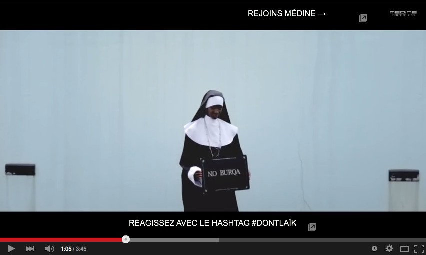 En plus des violences sociales, économiques, racistes, policières, les Musulman-e-s des quartiers populaires devraient aussi accepter d'un coup une laïcité qui ne s'adressait plus qu'à elles et à eux. Car la chrétienté a, cependant, conservé toutes ses prérogatives dans les médias publics, les visites de ministres au Vatican, ses écoles, ses symboles et références en tout genre. Le discours a été reçu cinq sur cinq: il y aurait la religion tolérée et la religion intolérable. Une image du clip de Medine montre à ce propos une none catholique très voilée tenant un panneau "no burqa"...