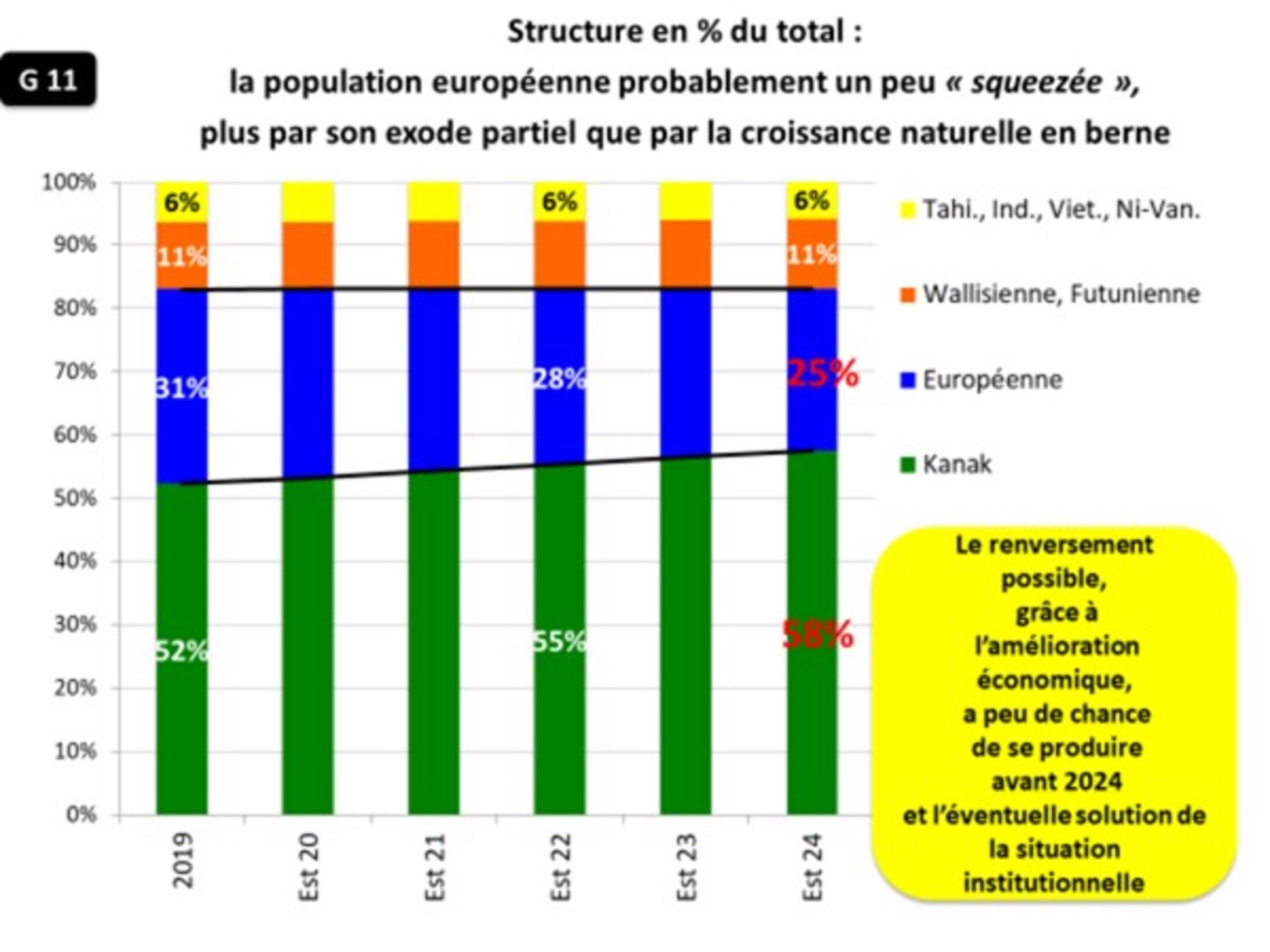 Déjà donc en 2022, l’ISEE n’appelait pas un chat un chat mais les Européens zoreils des « non- natifs ». Malgré les précautions de l’ISEE, c’était déjà un jeu d’enfant de répartir le solde migratoire net ; j’ajoutais : « Le résultat est frappant ; on comprend mieux pourquoi l’ISEE ne s’y est pas hasardé : c’est politiquement très gênant compte tenu du blocage actuel des négociations sur l’avenir institutionnel et la sortie des Accords de Matignon-Oudinot de 1988 et de Nouméa de 1998, la date butoir d’éventuels nouveaux accords étant justement 2024. Les Kanak (G 11) deviendraient largement majoritaires au niveau du pays en 2024, avec 58 % contre 25 % pour les Européens : plus de deux fois plus. Si cette hypothèse pessimiste pour les tenants de la Calédonie française est risquée, celle d’un rapport 55-28 ou même 53-30 suffit à émouvoir les loyalistes et à réjouir les indépendantistes… ».
