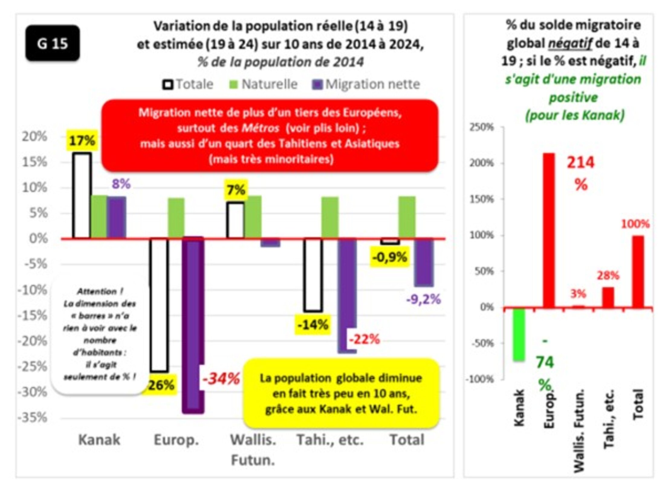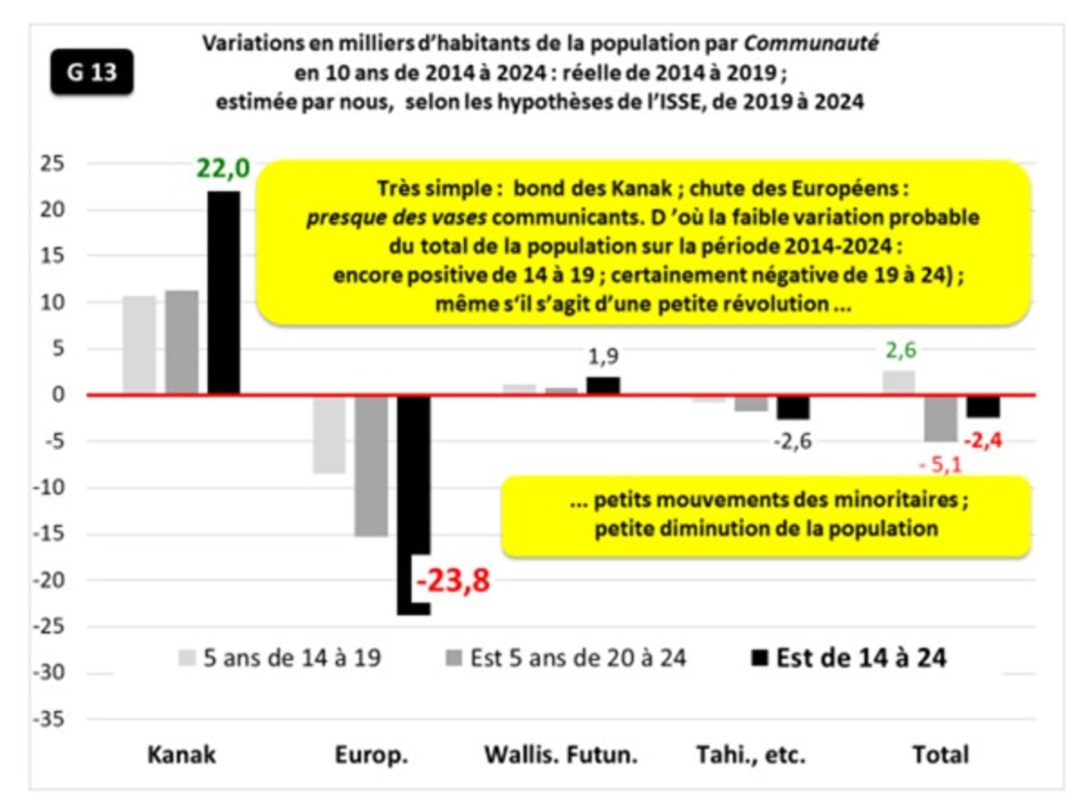 Je continuais par : « Tout a commencé en fait, répétons-le, dès 2014, l’ISEE ne s’en est rendu compte qu’avec le recensement de 2019 qui indiquait clairement le fort flux migratoire négatif net ; une lecture même pas trop attentive permettait déjà de comprendre que l’exode provenait des Européens, et en particulier des Métros. L’ISEE l’écrivait de façon plus soft : "Le net fléchissement démographique s’explique par un solde migratoire apparent devenu négatif pour la première fois depuis près de quarante ans. Entre 2014 et 2019, 27 600 personnes qui vivaient en Nouvelle-Calédonie en 2014 ont quitté l’archipel, soit un habitant sur dix. Les trois quarts des départs concernent des personnes qui ne sont pas nées en Nouvelle-Calédonie … Inversement, 17 300 personnes qui ne vivaient pas sur le Caillou en 2014 sont arrivées depuis.... Le solde migratoire apparent est déficitaire de 10 300 personnes entre 2014 et 2019, soit 2 000 départs nets par an". Résumé : "L’émigration importante de non-natifs explique en partie ce résultat". Il faut lire les tableaux pour comprendre que les Européens ont en effet diminué de 7,7 milliers ; quand même près de 11 % de moins qu’en 2014… ».