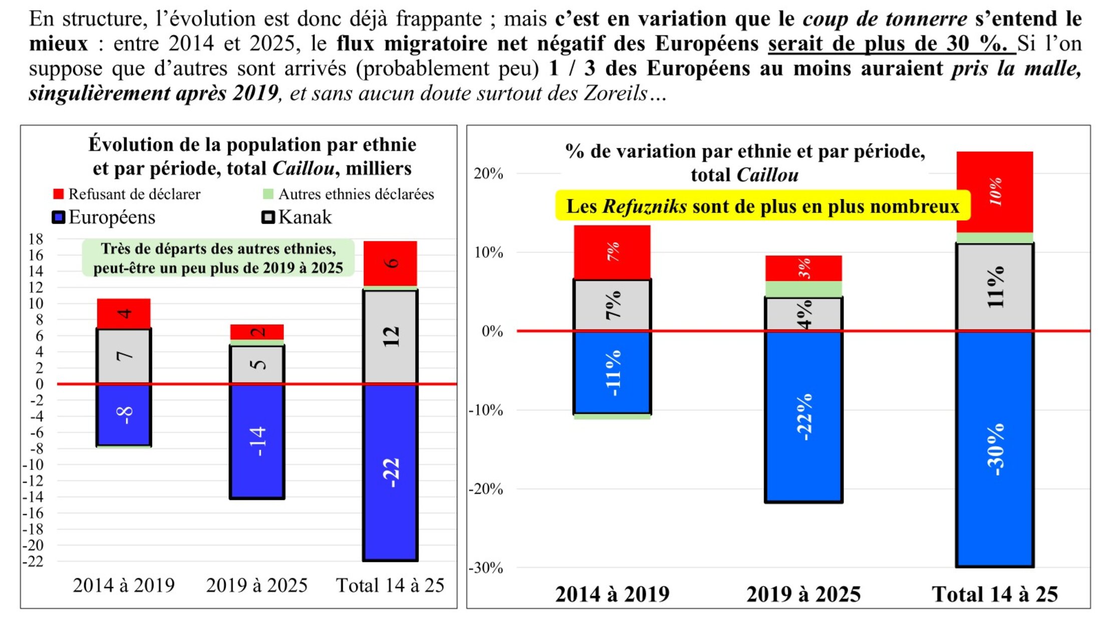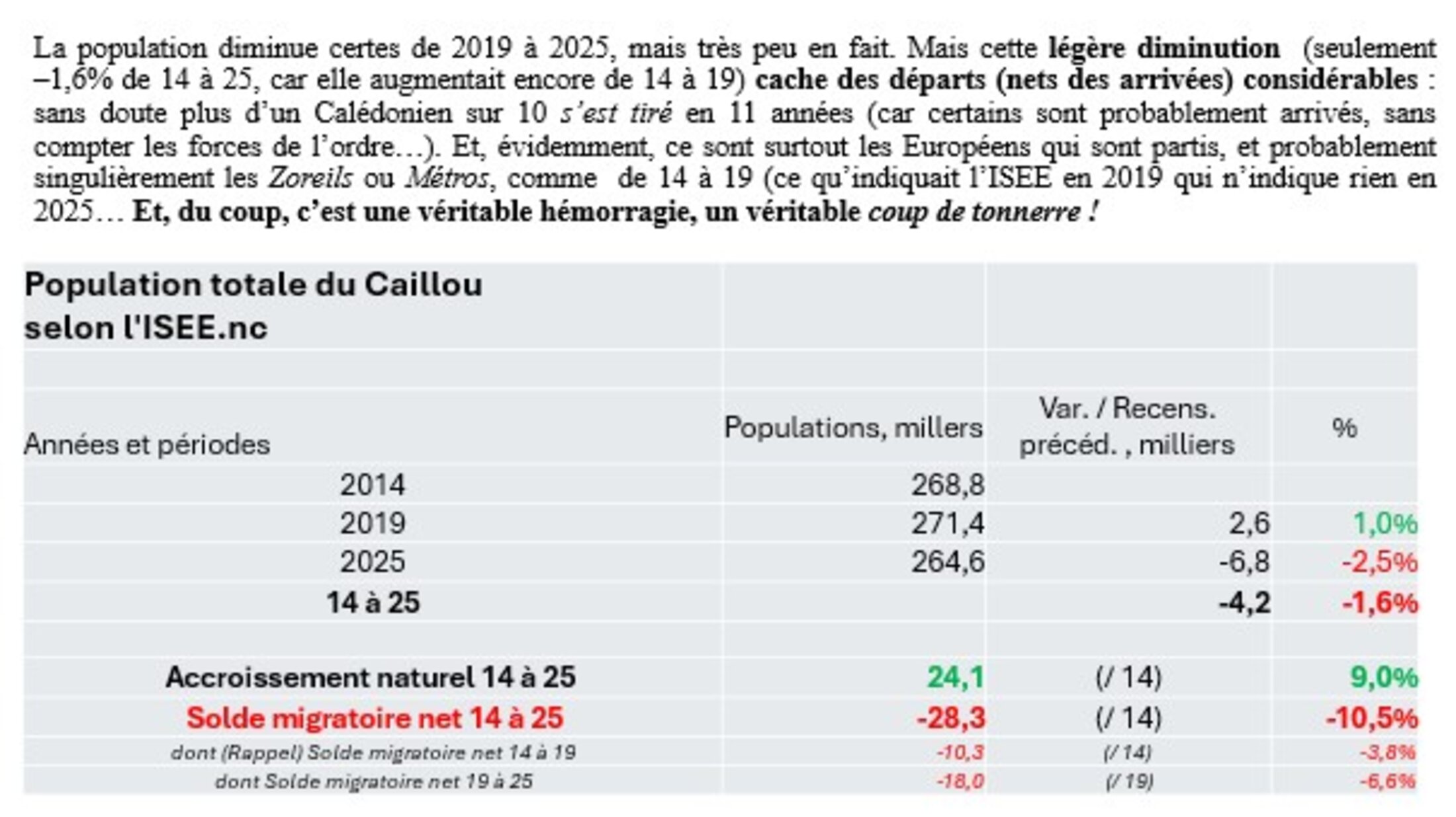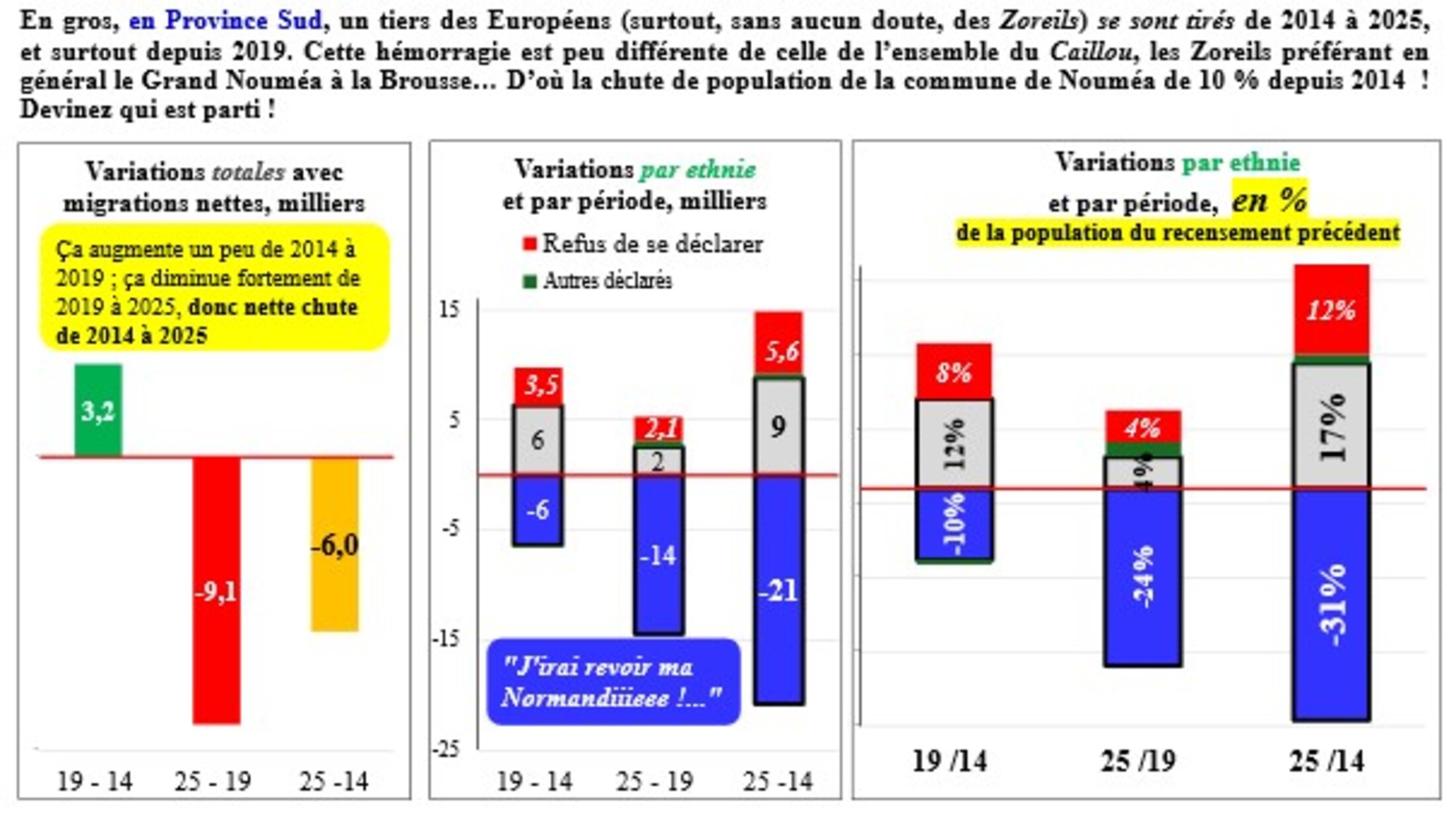 Pas un mot, pas un, dans le premier article indiquant qui est parti ! « Le profil des partants », non connu...) ; « Baisse globale, départs, solde naturel : les enseignements du recensement 2025 en Calédonie, qui compte 264 596 habitants. […] La baisse d’attractivité n’a pas été assez compensée par les naissances. […] C’est la première fois depuis 1946 que la population calédonienne baisse entre deux recensements, relève l’AFP. […] Un solde naturel moins fort, face à un solde migratoire plus dégradé ». Est noté néanmoins pour la période 2019-2025, « Un "solde naturel" positif (+ 11 000) […] Par ailleurs, la différence entre les départs du Caillou et la venue de nouveaux arrivants est au contraire négative (- 18 000) ».