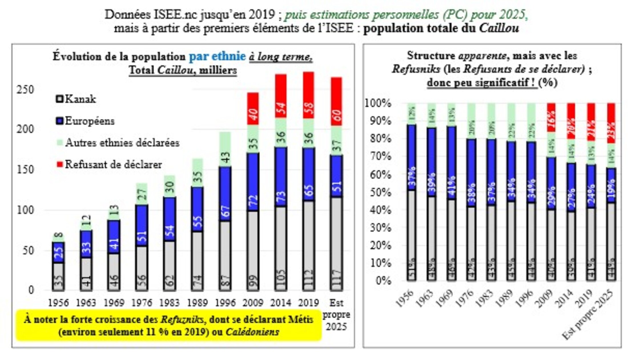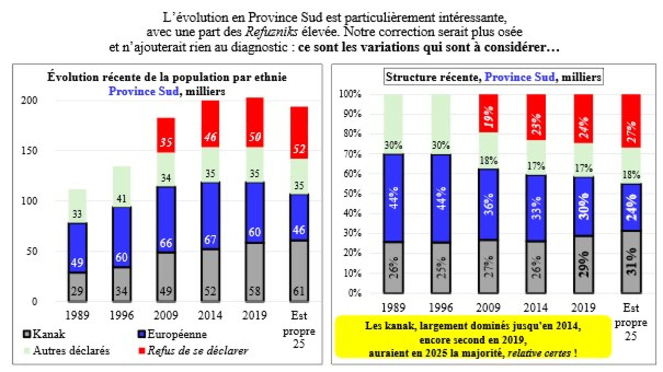 Les Kanaks, toujours à 44 % en 2025 selon les estimations des données brutes de l’ISEE (contre 41 % en 2019) sont déjà largement devant les Européens passant de 24 à 19 %. Mais en données corrigées, les Kanak, frôlant les 50 % depuis en fait 2009, sont devenus majoritaires en 2019 et sont peut-être à 57 % actuellement ! Avec toutes les conséquences démographiques et, évidemment, politiques.