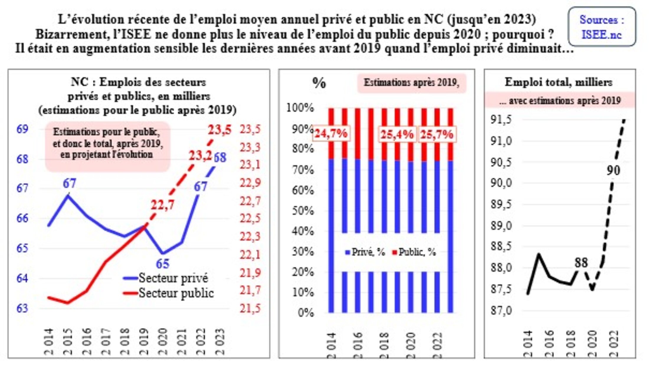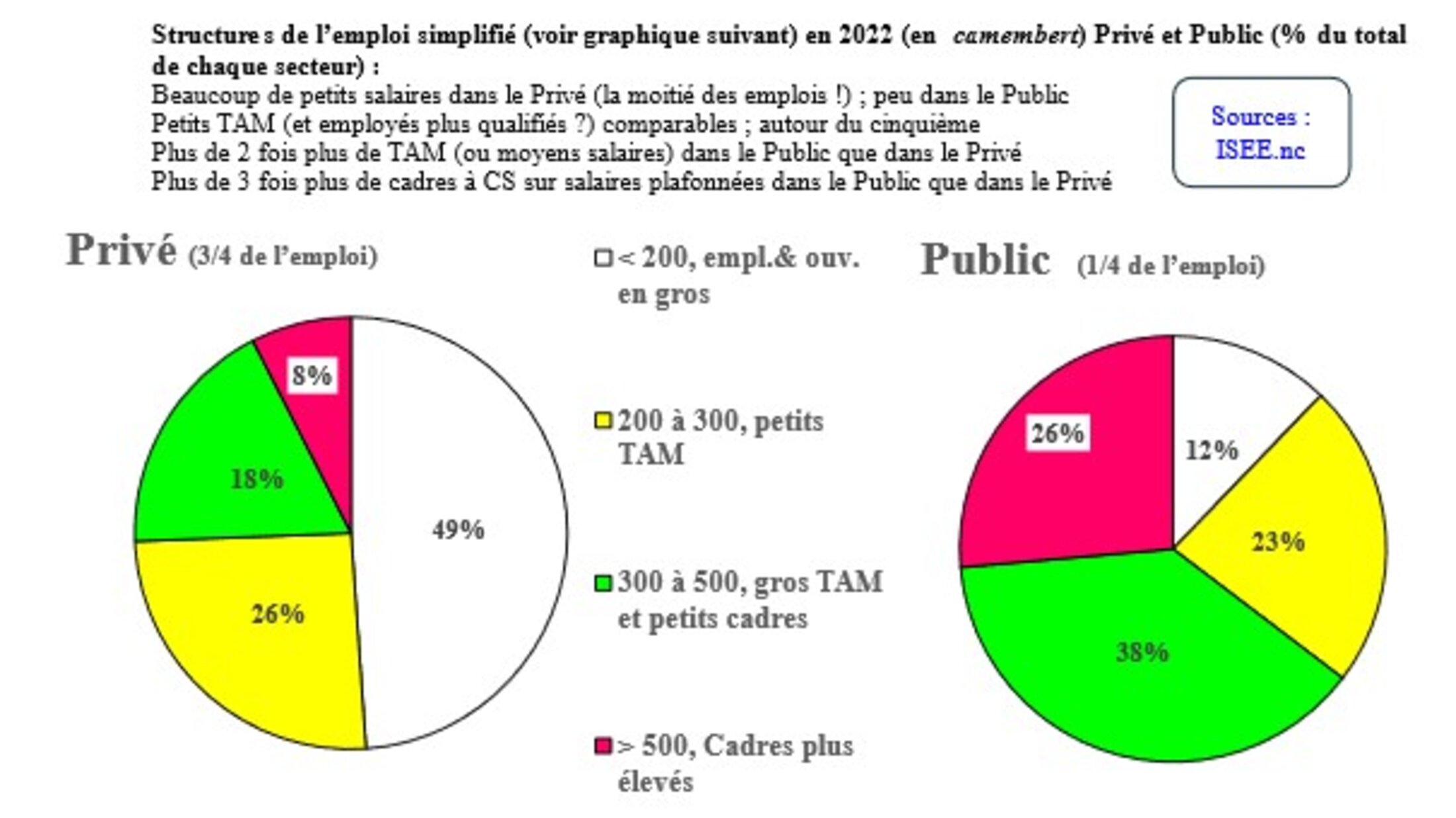 L’emploi salarié en Calédonie se répartit entre secteur privé (en gros les ¾ du total d’environ 90 milliers en 2023, avant la cata de 2024-2025, et secteur public (en gros le quart).