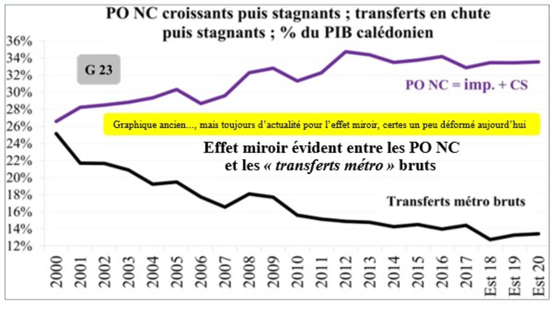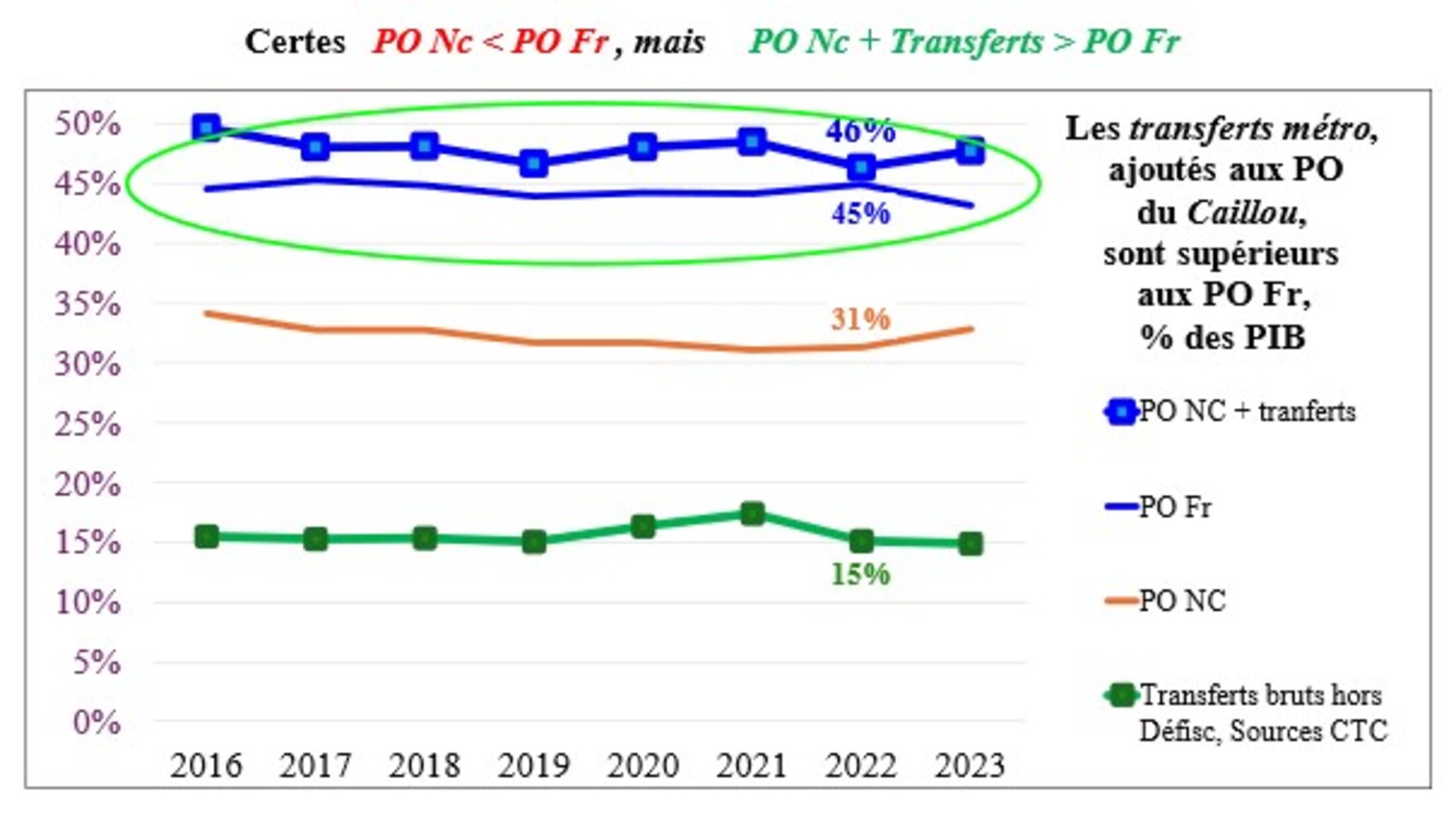 Je faisais déjà remarquer en 2023, par le graphique suivant, l’effet miroir évident entre l’évolution du taux de PO sur le Caillou et celle des « transferts métro ». On est loin de la conception de Sudrie des transferts moteurs de la croissance...