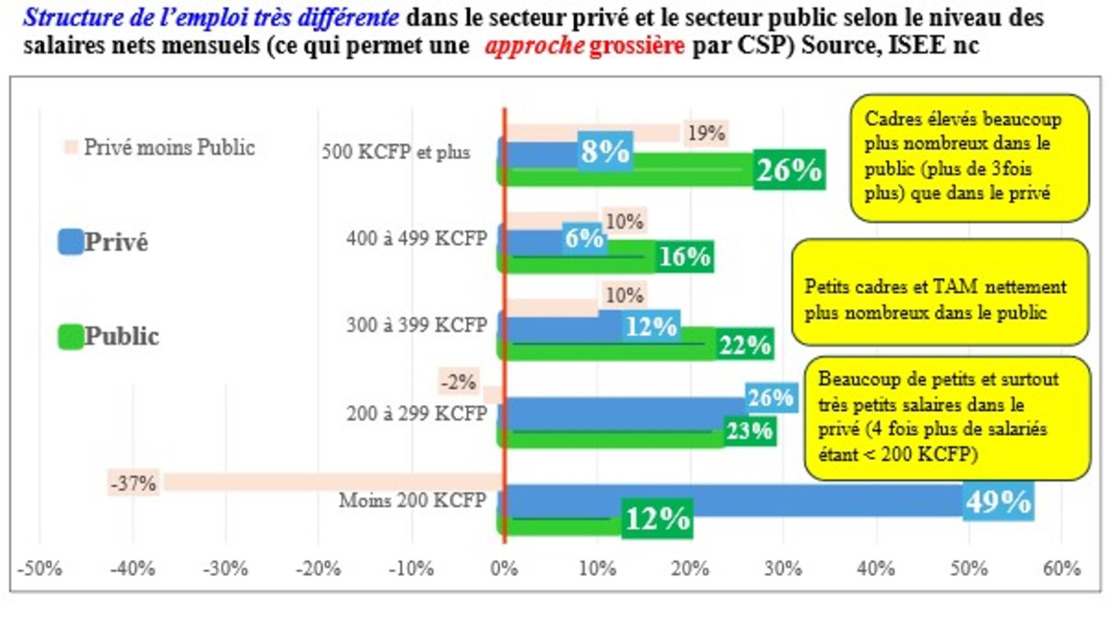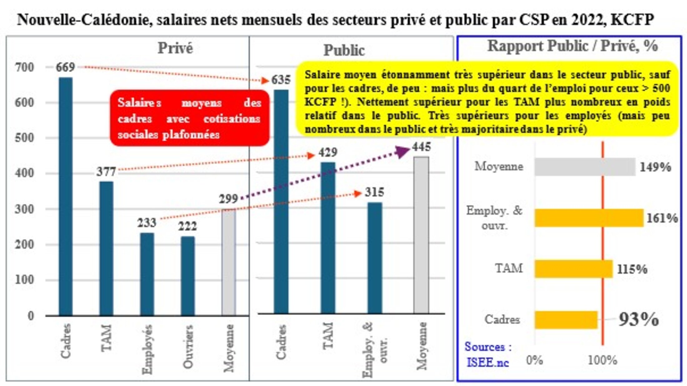 La structure des salaires est aussi très différente entre le Privé et le Public ; le plafonnement des cotisations sociales[12] pour les salaires > 500 KCFP concernent la majorité des cadres.