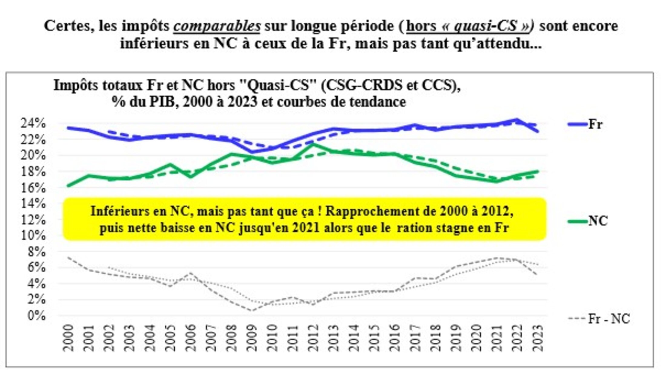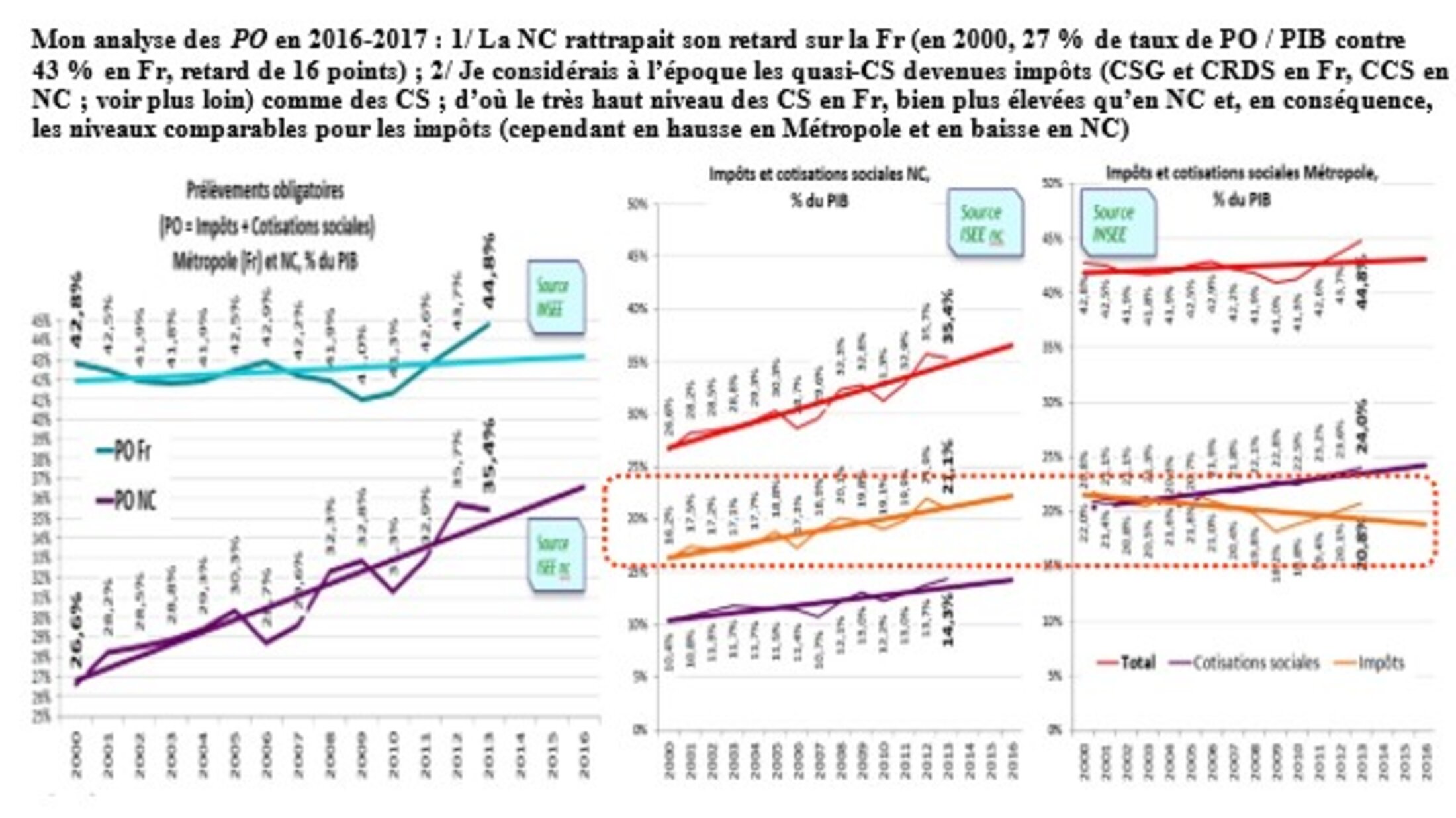 Les CS (cotisations sociales, rappelons-le encore) apparaissaient ainsi très dominantes dans les PO Fr et très faibles dans les PO NC, avec un écart considérable constant d’environ 10 % de PIB pour la NC. C’était vrai si l’on considérait la GSG-CRDS comme des CS, alors inexistantes en NC avant 2015... Sauf que, par conséquent, et ce qui étonnait (on va évidemment y revenir ; penser encore au suspense mentionné plus haut) les impôts du Caillou, jugés par beaucoup bien maigrichons, étaient alors au même niveau qu’en Fr, mais, là, déchargés de la GSG-CRDS !