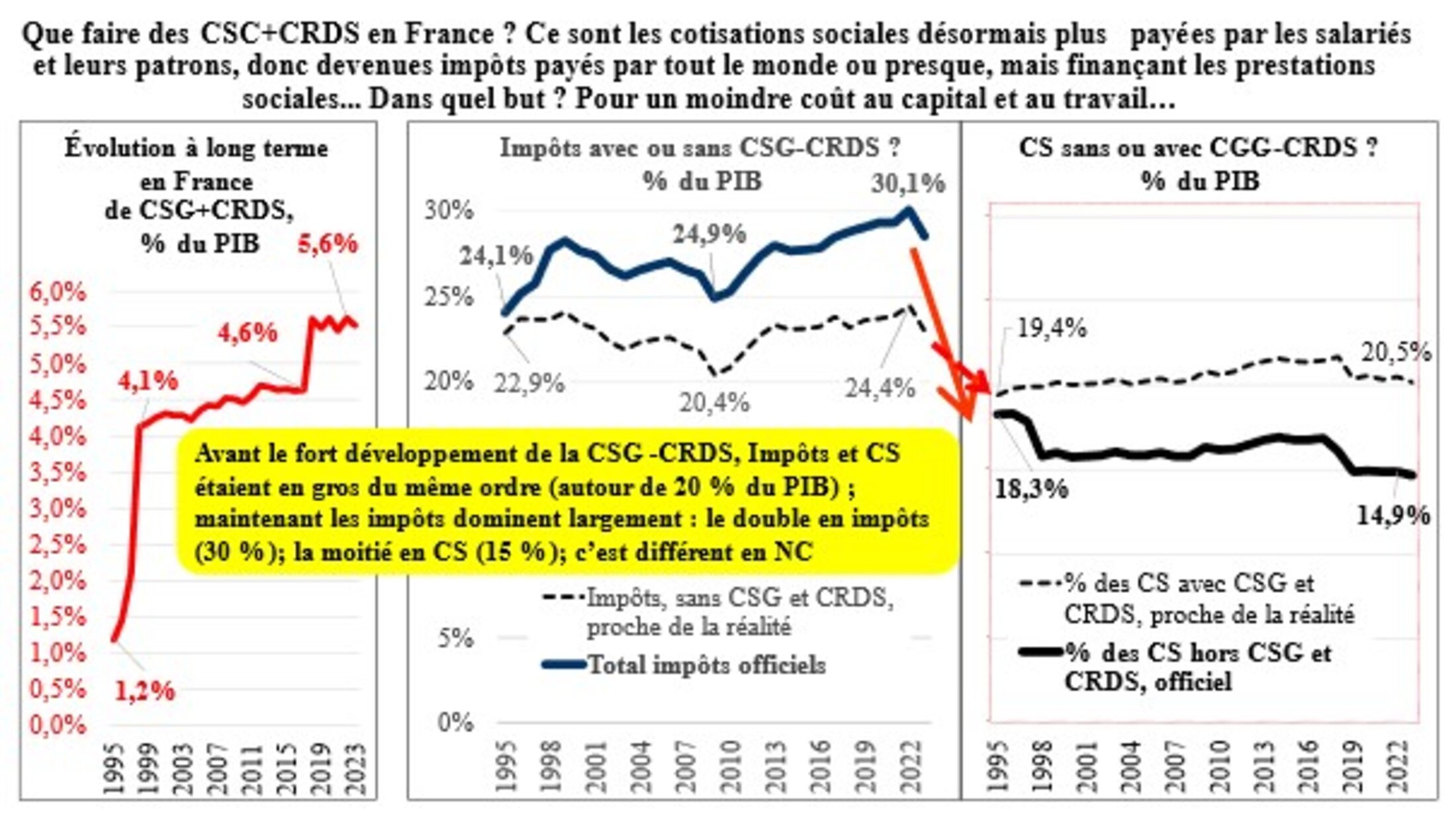 Que l’on affecte en Calédonie dans les analyses, la CCS dans les impôts ou dans les CS a peu d’importance, car son niveau est pour le moment très faible : la structure Impôts / CS est peu modifié. En France, cela change tout comme le montre le graphique suivant déjà publié en 2023.