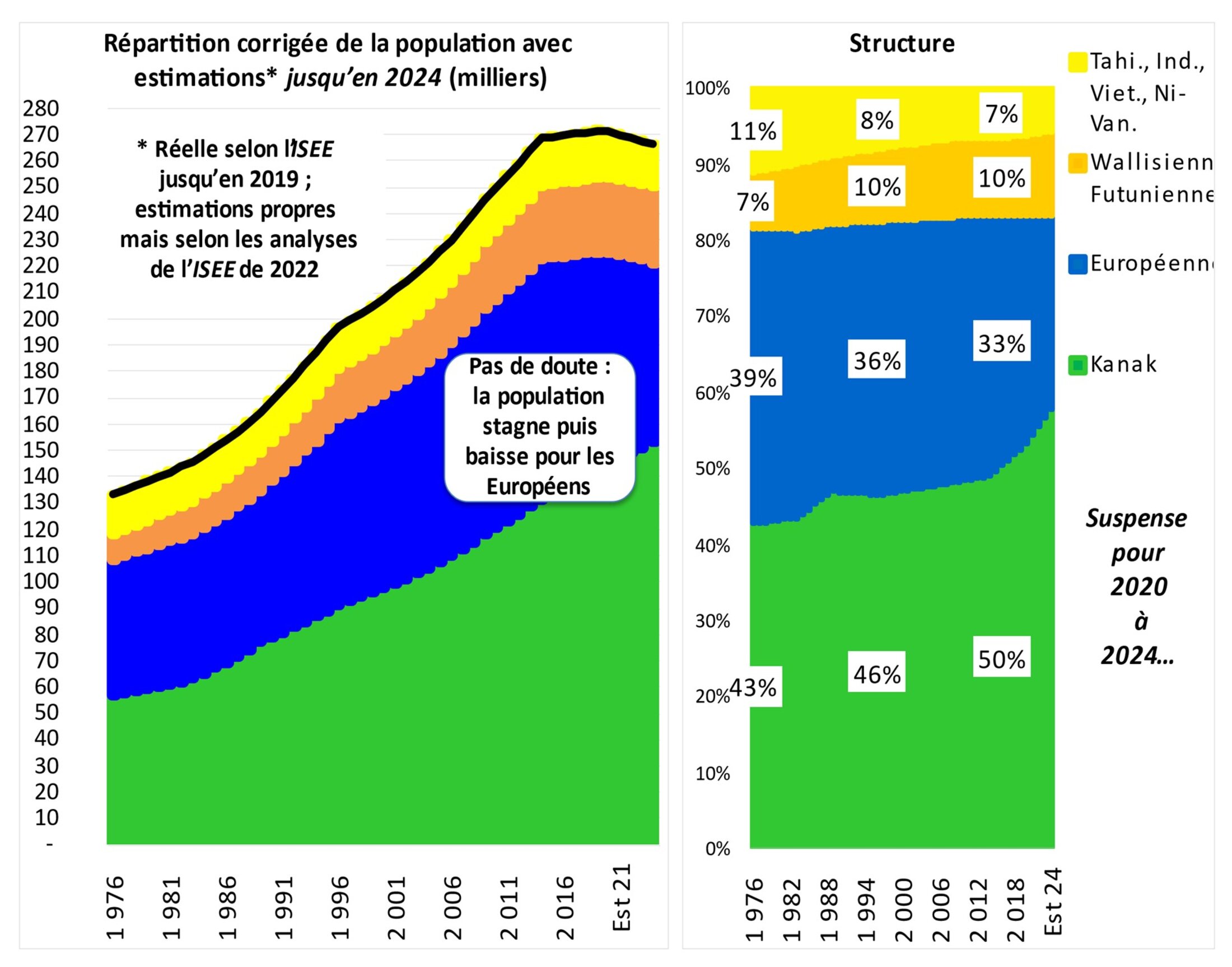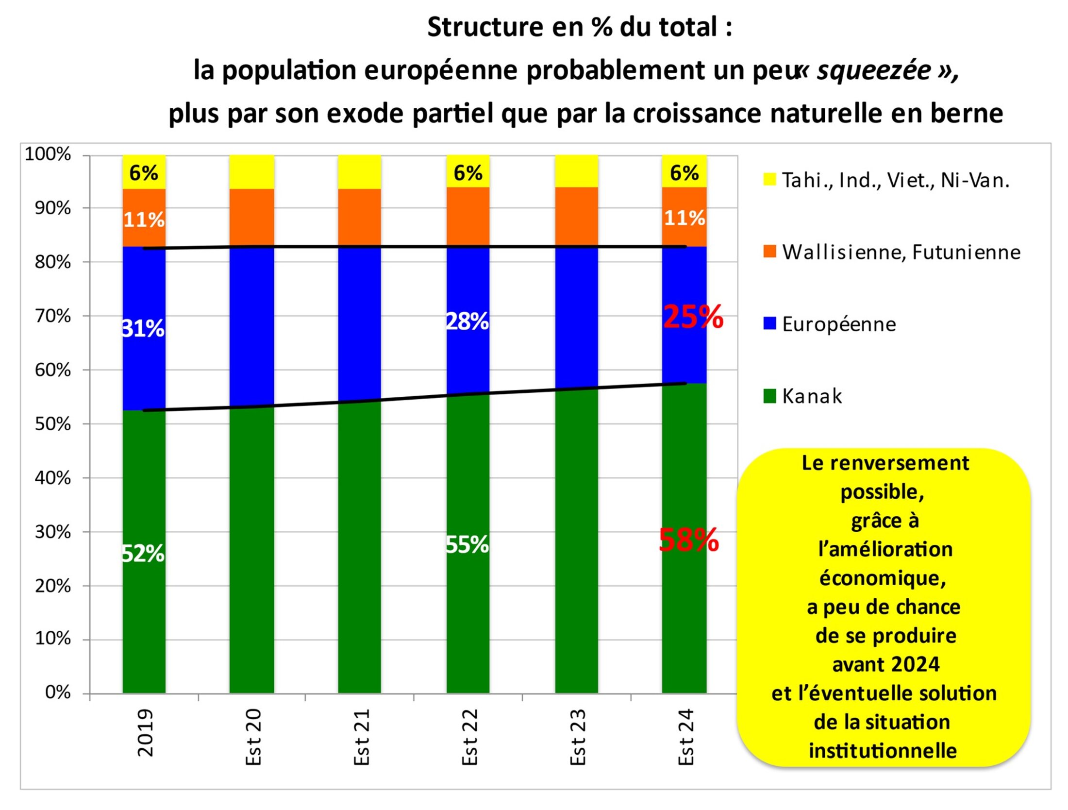En 2021-2022, toujours pas de buzz ; mais quelques murmures au MEDEF local qui, pour une fois, se fait l’adepte de l’offre expliquée par la demande et voit d’un mauvais œil la consommation s’écrouler ; tout en se plaignant cependant du manque de main-d’œuvre (qualifiée) comme conséquence de cet exode qui risque de faire déraper le coût du travail… Catastrophe politique, encore peu évoquée, où ce Grand remplacement à l’envers verra peut-être la population kanak devenir ultra-majoritaire en 2024 (avec autour de 58 %, contre 25 % pour les Européens[14]) année charnière en matière de transformation institutionnelle.