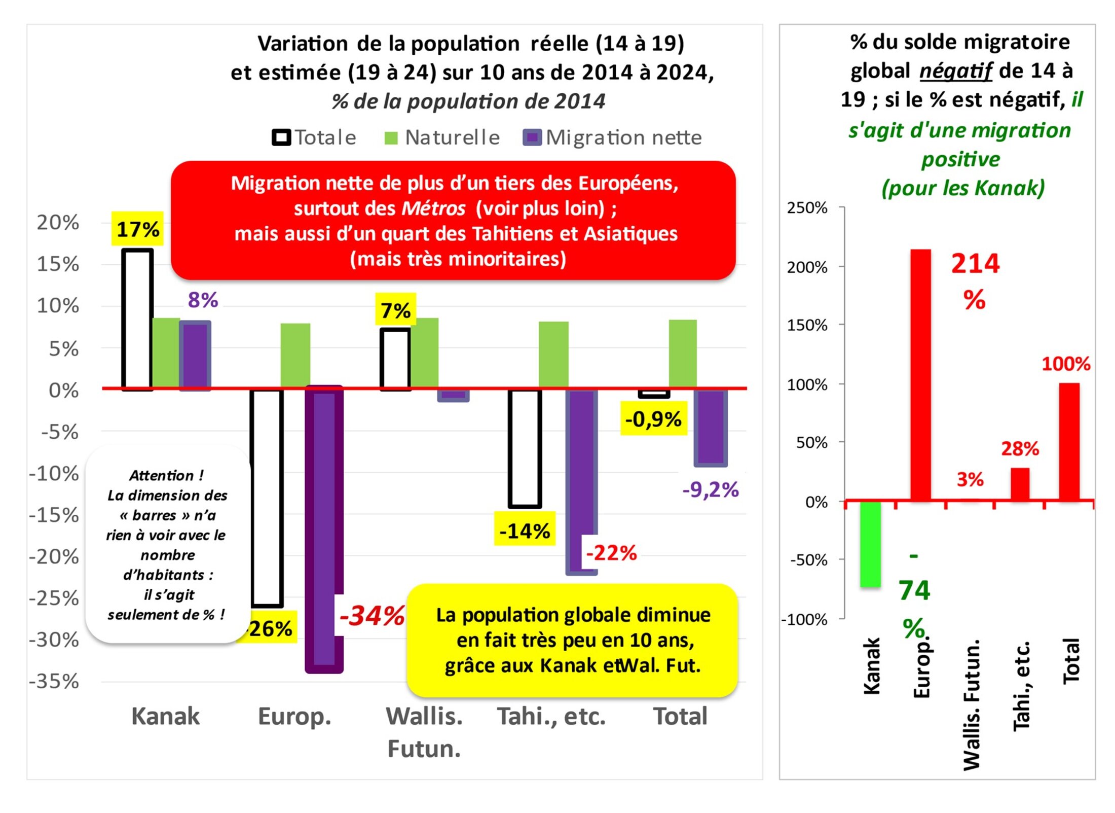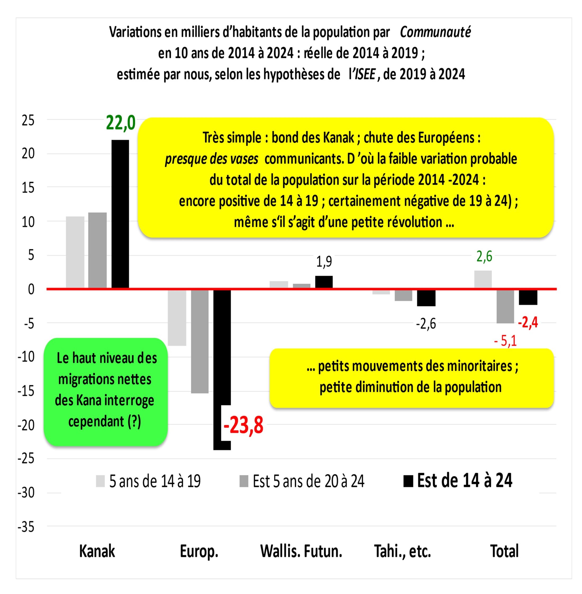 De 2020 à 2024 en cumul, la population Kanak pourrait augmenter de 11 milliers ; celle des Européens chuter de 15 milliers. Bof, 15 milliers de moins ! Mais sur un pays de moins de 300 milliers d’habitants dont environ 100 milliers d’Européens… C’est - 5 % des habitants du Caillou et peut-être 15 % des Européens qui s’envoleraient (après des arrivées qui continueront pourtant) ; un peu plus qui prennent l’avion, car il reste une croissance naturelle positive, certes érodée : bref, il y aurait bien plus d’un Européen sur cinq qui aurait fui, de 2014 à 2024, l’Eldorado manqué ! Les Wallisiens devraient rester et même croître, comme sur 2014-2019 ; les ethnies très minoritaires, autres Océaniens et Asiatiques, s’envoleraient également (- 10 %), mais en nombres absolus bien plus faibles.
