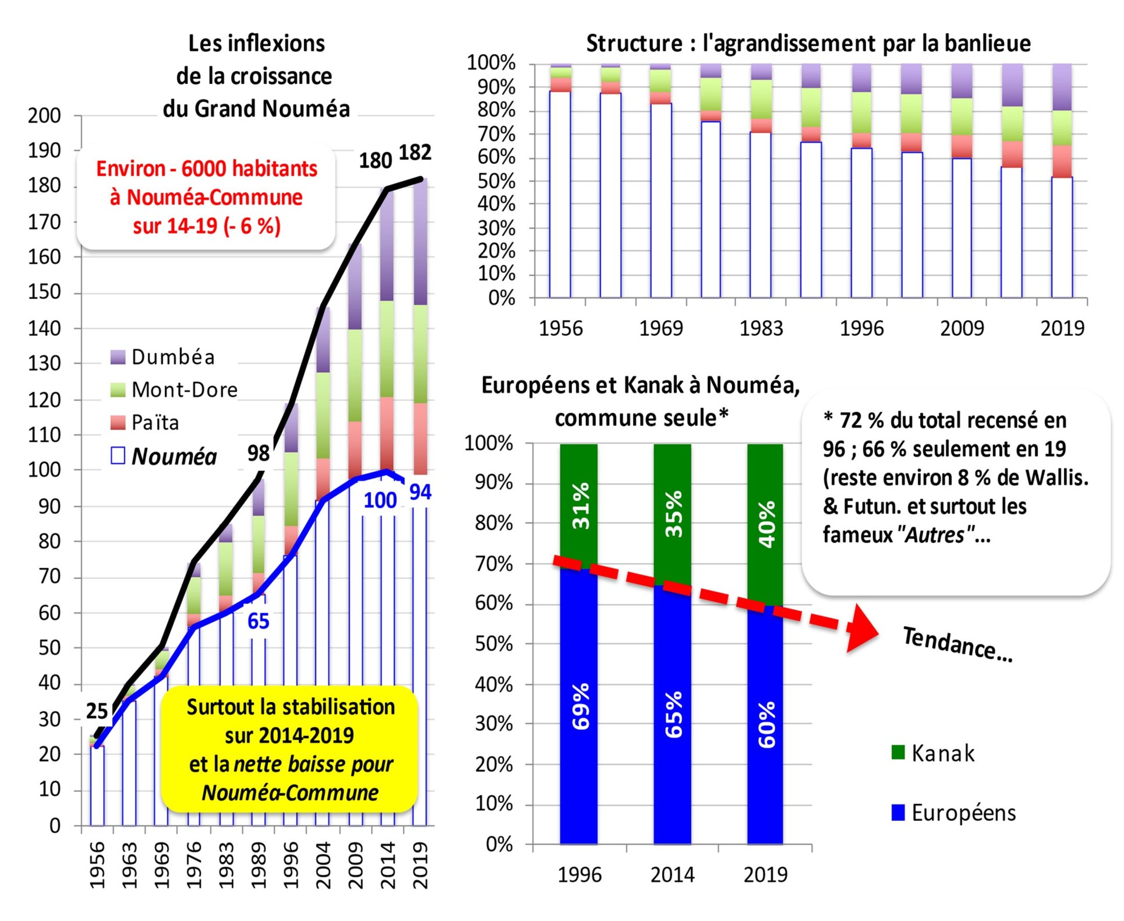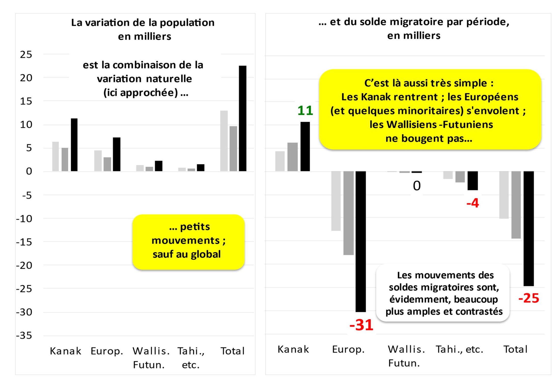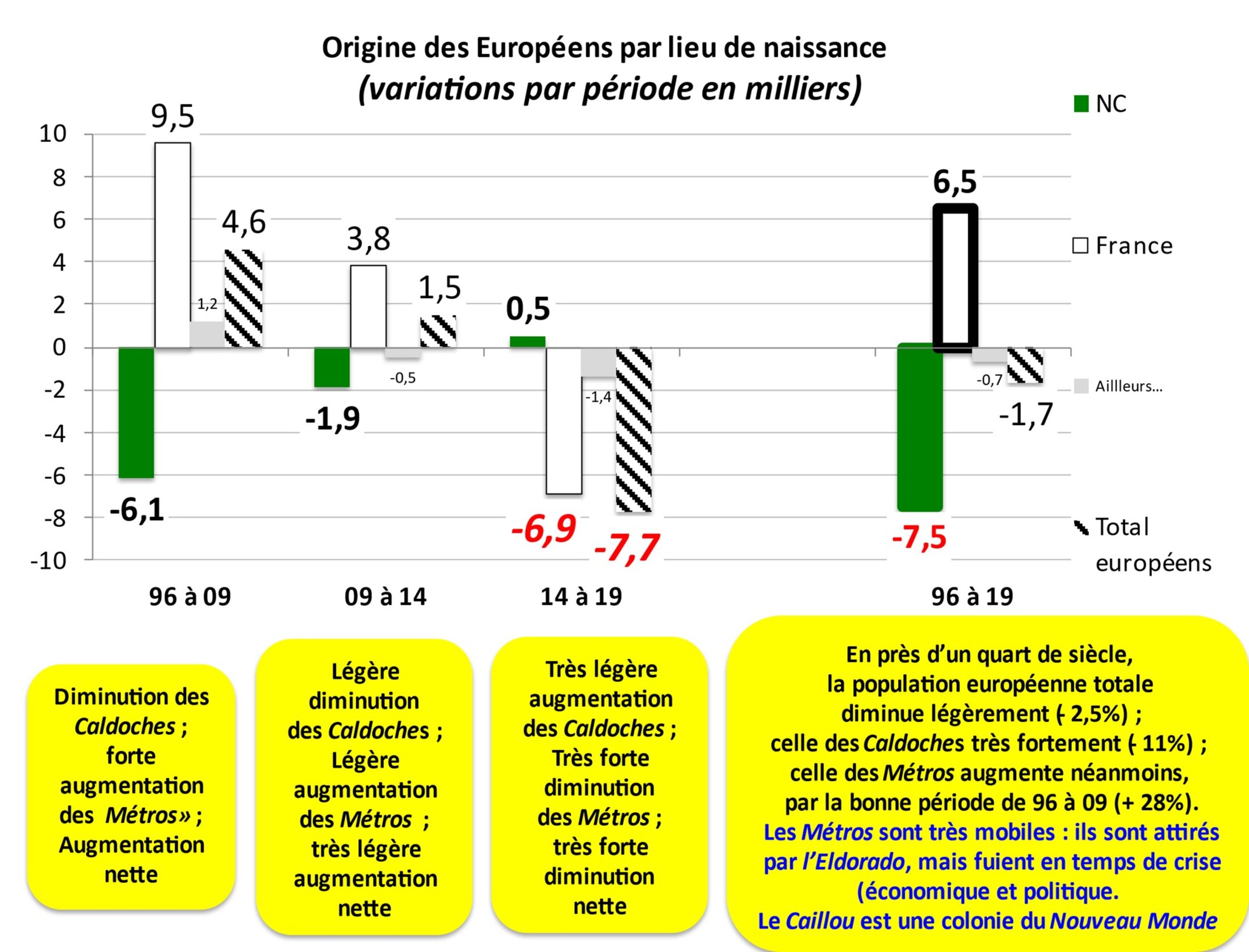 Pour ceux qui s’interrogent encore : de 1996 à 2009, c’est l’Eldorado (plus près de 10 milliers de Métros de plus), avec quelques Caldoches s’éteignant (- 6) ; de 2009 à 2014, c’est la même chose, en plus discret (respectivement + 4 et - 2) ; de 2014 à 2019, renversement complet (- 7 et + 0,5 respectivement) ; sur toute la période de près d’un quart de siècle, l’équilibre est presque parfait (+ 6,5 pour les Métros ; - 7,5 pour les Caldoches).