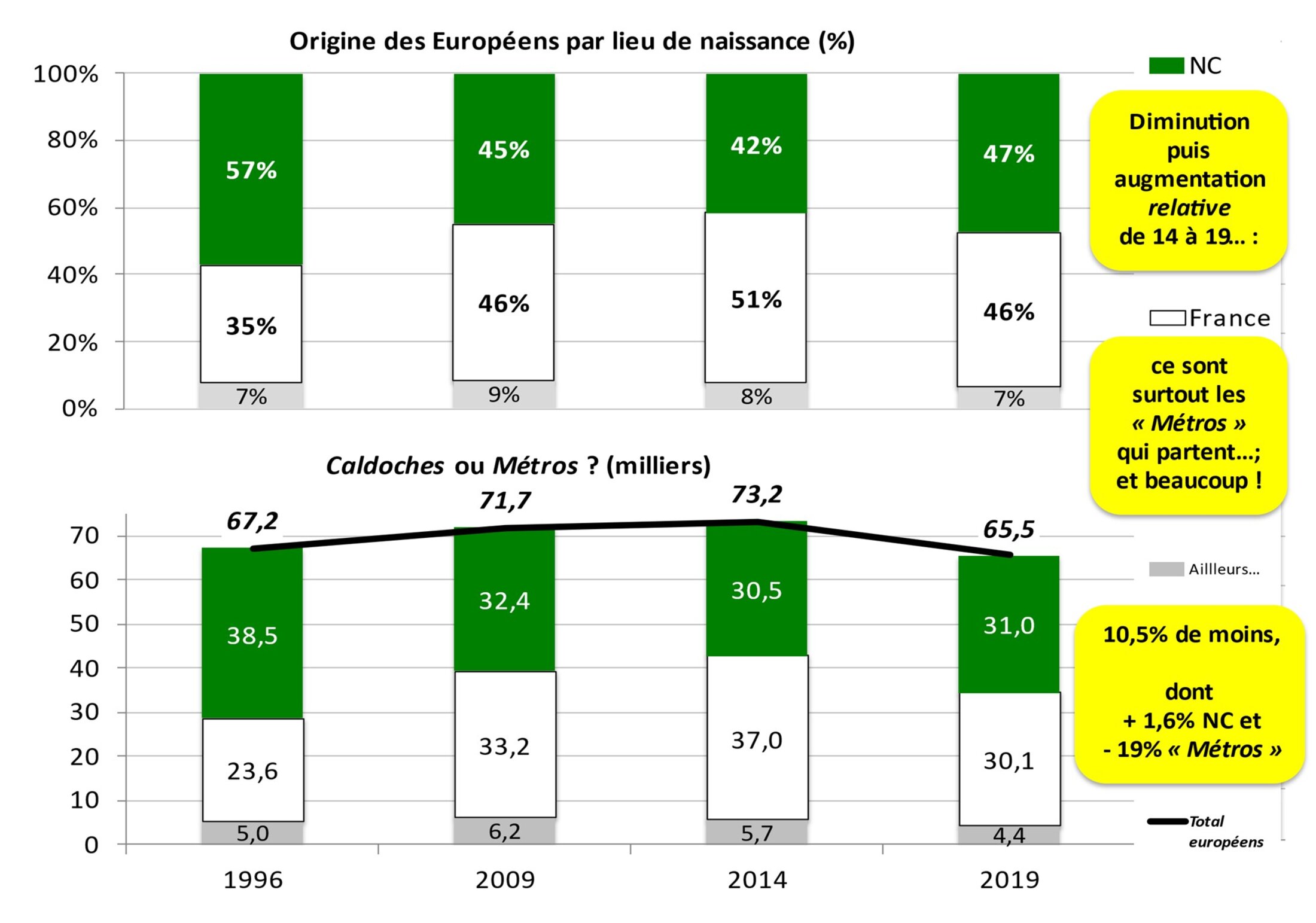 Les Européens se divisent (et pas seulement statistiquement ; mais là, l’ISEE est précis) entre Caldoches (nés sur le Caillou) et Métros, ou Zoreils, nés en général en France ou dans les ex-DOM-TOM (qui ont changé de nom ; mais qu’importe) : en gros, moitié-moitié en 2019 : 47 % nés sur le Caillou, 46 % nés en France, mais aussi 7 % nés à l’étranger ; en 1996, les proportions étaient assez différentes : respectivement, 57 % ; 35% et encore 7 %. Bref, les statisticiens nous permettent de mieux comprendre ceux qui arrivent ou s’envolent. L’immigration nette positive des Métros vers l’Archipel qui a fait son œuvre de 1996 à 2014 : (en milliers) + 13,4 pour les Métros ; - 8,0 pour les Caldoches qui ne sont pas immortels ; + 0,7 pour les nés à l’étranger. L’Eldorado : bonne activité économique et référendums encore loin. Renversement donc de 2014 à 2019 : - 7,7 milliers d’Européens de moins, dont 0,5 Caldoches de plus (il y a des jeunes qui font des petits) - 6,9 Métros et - 1,3 nés à l’étranger envolés. La fuite face à la crise économique et à la proximité des prises de décision démocratiques institutionnelles.