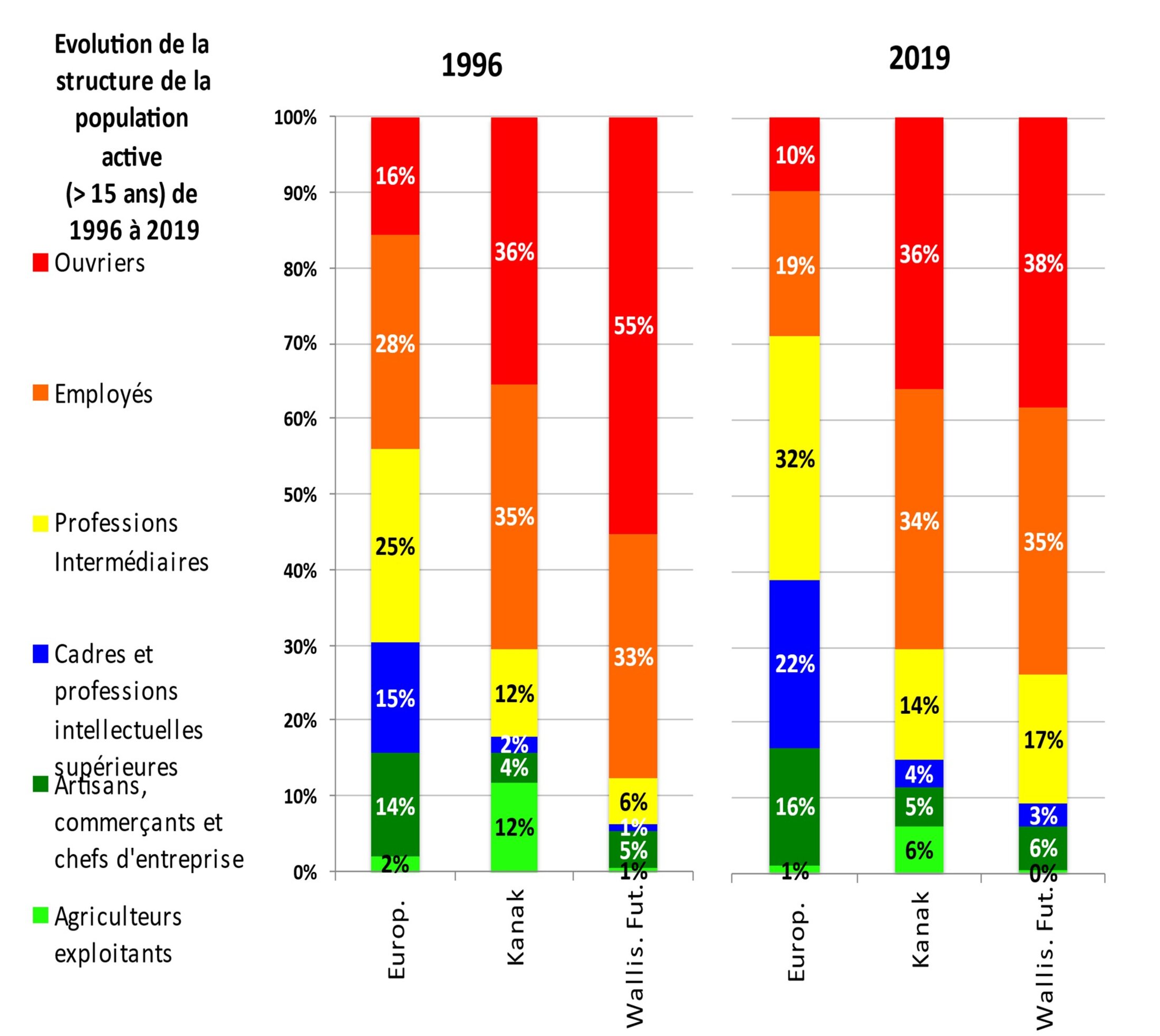 La structure de la population active a certes évolué de la fin des années 1990 à la fin des années 2010… mais plutôt au bénéfice des Européens : 1 sur 6 était ouvrier en 1996 et 1 sur 10 en 2019 ; 28 % étaient employés en début de cette période et 19 % à la fin ; 40 % appartenaient aux professions intermédiaires et cadres au début de cette période et 54 % à la fin. Les éleveurs de brousse ont toujours été marginaux (2 % des Européens en 1996) et le restent en 2019 (1 %). Certes, les Kanak étaient encore en partie aux champs en début de période (12 % des leurs) mais y sont encore pas mal (6 % ; sans compter que ce fameux champ reste encore fondamental pour une grande partie de ceux qui vivent maintenant à Nouméa et dans sa banlieue) ; la proportion des ouvriers est la même sur toute la période (un gros tiers) idem pour les employés ; la proportion de Kanak dans les classes moyennes (professions intermédiaires et cadres) a en effet doublé (5 % au début ; 11 % à la fin) ; mais ça ne fait encore pas grand monde. Grâce aux discriminations positives et aux différents plans de formation, les Kanak prennent plutôt un escalier étroit que l’ascenseur social… Les Wallisiens-Futuniens étaient ouvriers à 55 % en 1996 ; ils ne sont plus que 38 %, mais, gros bras, forment les gros bataillons des ouvriers dans le BTP : ils sont peu passés employés (respectivement 38 % et 35 %), mais pas mal « classe moyenne-Middle Class » (7 % à 20 %) : leur dynamique est ainsi très différente de celle des Kanak.