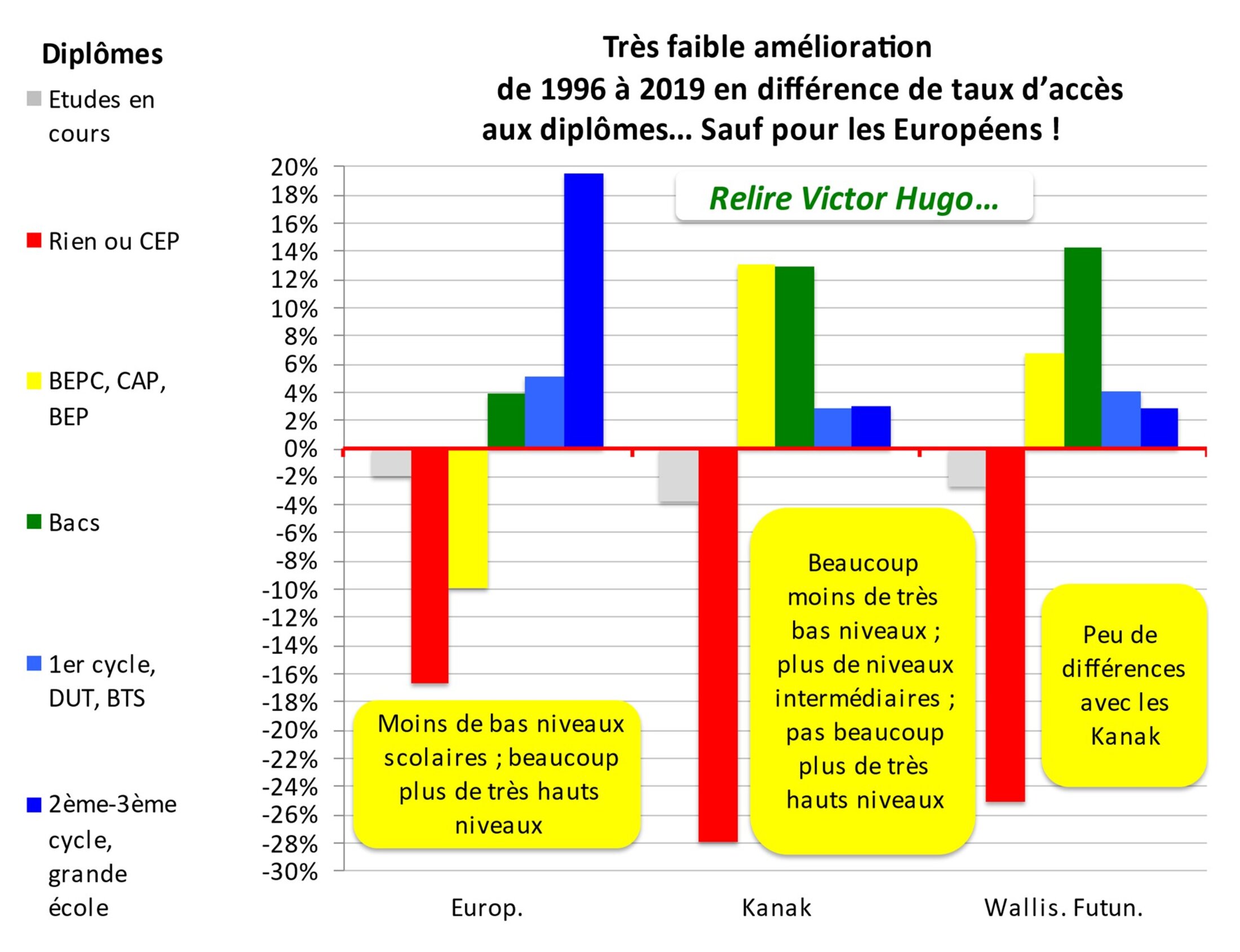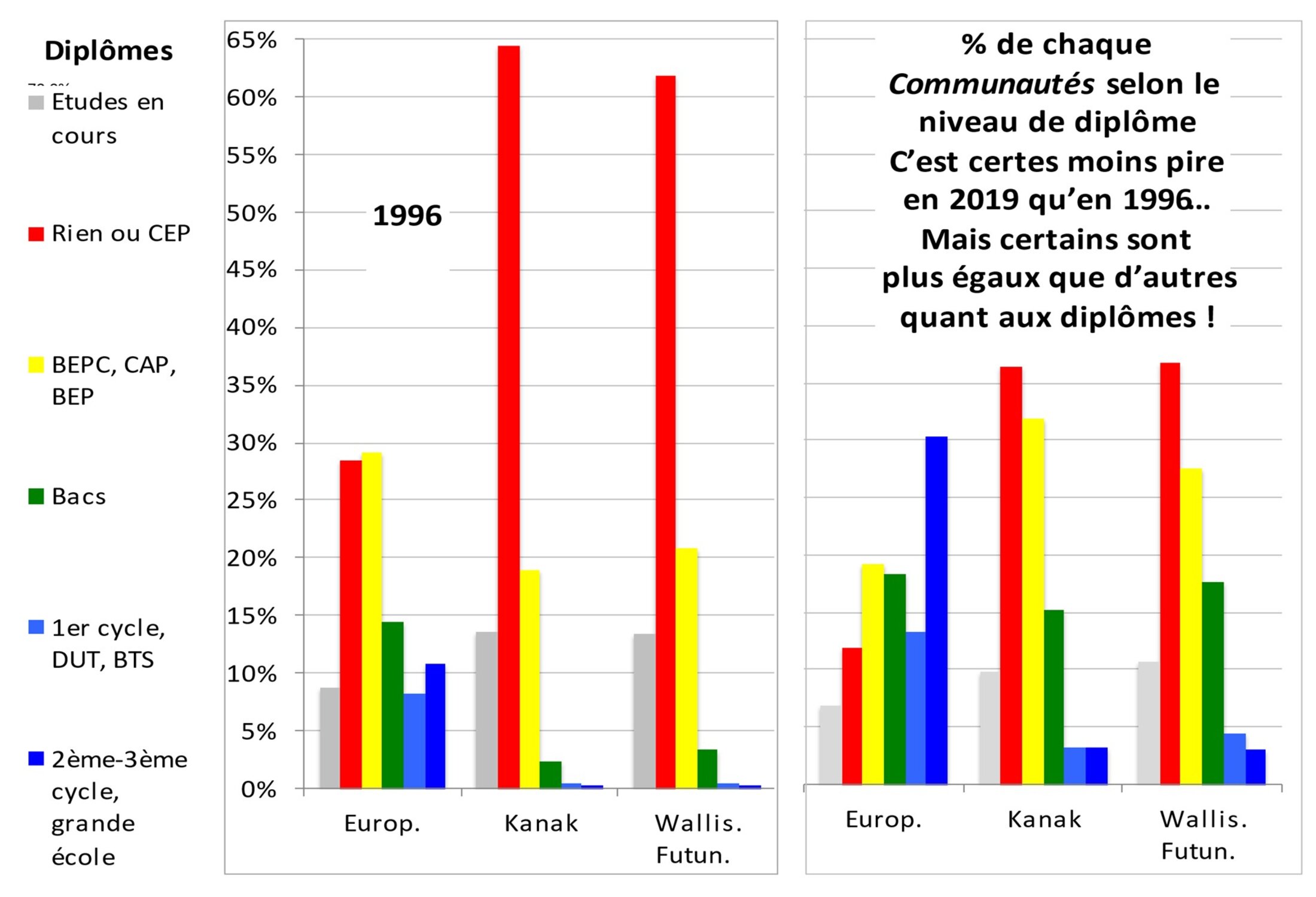 La seule vision des graphiques qui suivent est éclairante : les Européens montent en grade de diplôme, et ça se voit ; les Kanak également, mais ça se voit moins pour les post-bac, beaucoup mieux pour le niveau Troisième et plus et Bac. Mais ils reviennent de loin : près des deux tiers sans plus que le Certif (le CEP, le Certificat d'études primaires officiellement supprimé en France en 1989) en 1996 (cependant beaucoup mieux que du temps de Leenhardt) un peu plus d’un tiers en 2019 ? L’évolution du profil des Wallisiens-Futuniens est peu différente.