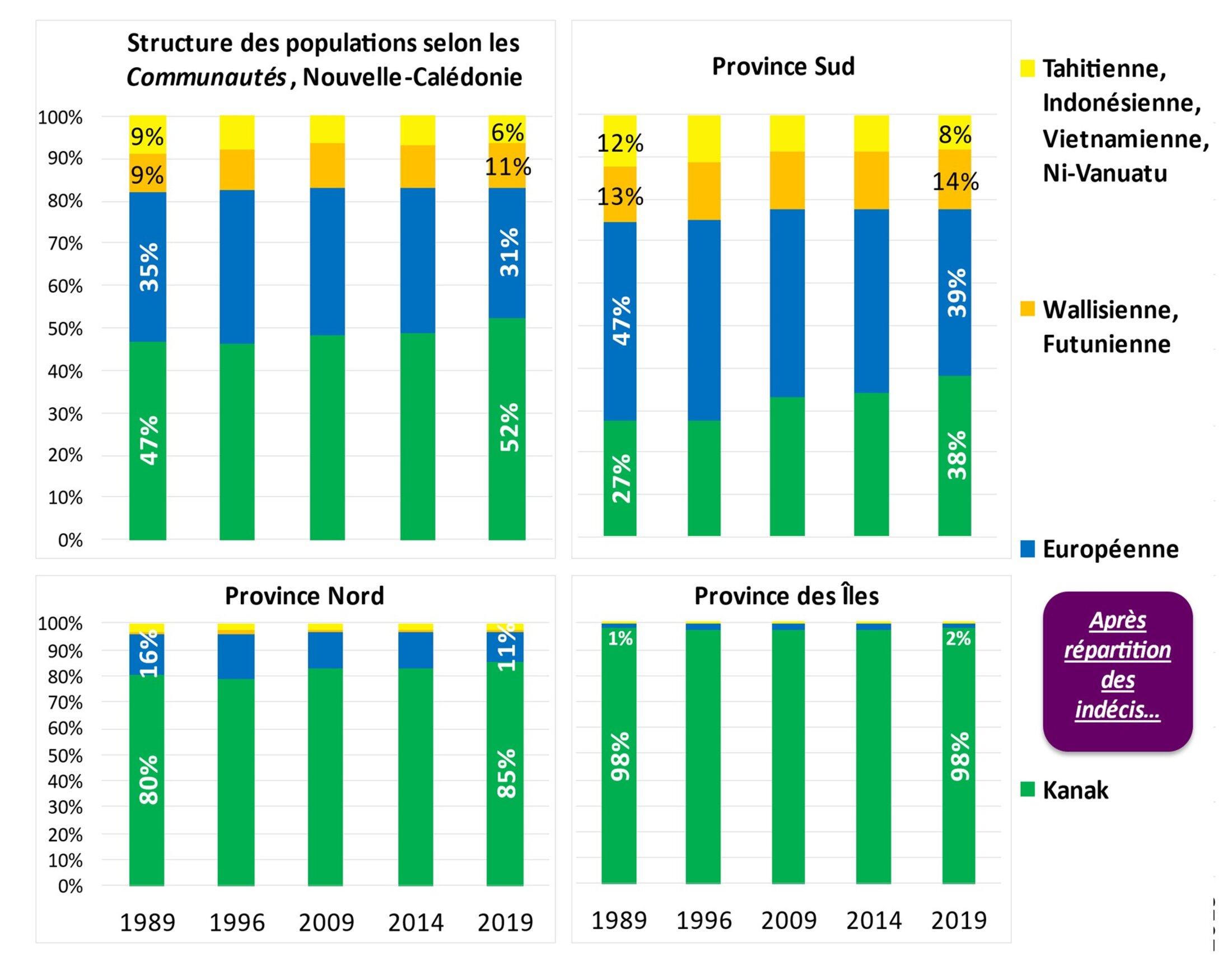Notre solution consistant à répartir ces indécis au prorata des réponses permet sans doute (même s’il s’agit d’une évaluation pas loin du doigt mouillé) de mieux appréhender la structure par ethnie du Caillou. Ce qui est sûr, c’est que même ce doigt mouillé ou ce pifomètre sont sans doute plus proches de la réalité que le ressassement des données brutes qui sous-estiment le poids des Kanak. Le fait que l’ISEE n’ait pas tenté d’affiner ces données brutes interroge.