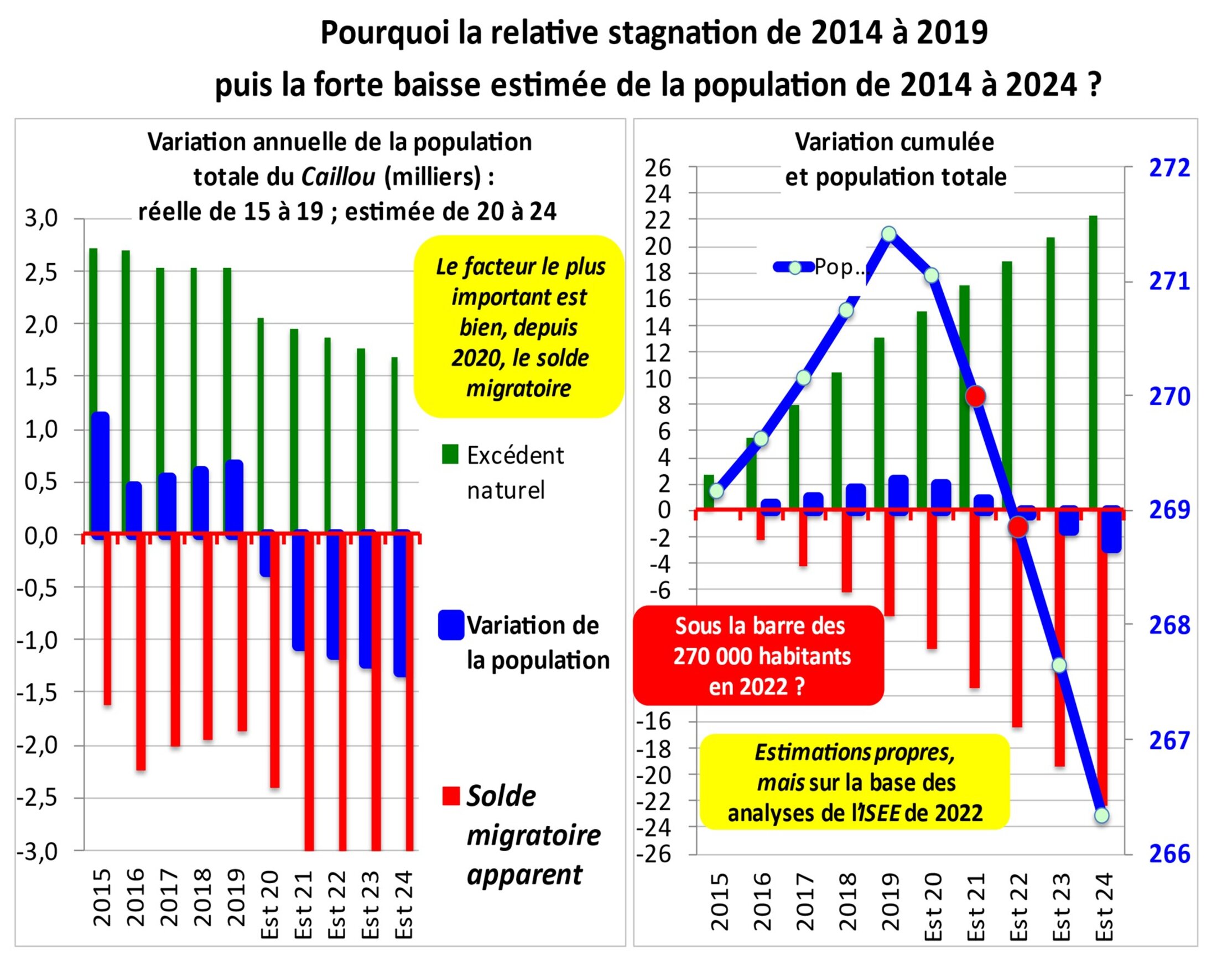 En septembre 2022, le même ISEE indiquait curieusement une croissance de la population en 2020 et 2021 ; mais se reprenait un peu plus tard notant : « Une dynamique démographique en berne dans un contexte atypique » ; il indiquait qu’au 1er janvier 2022, la population serait tombée sous la barre des 270 milliers d’habitants. Cette baisse serait simplement due (radotons…) mis à part les longs développements de l’ISEE sur la fécondité, la nuptialité et les décès, au solde migratoire déficitaire, en 2020 comme en 2021, le solde migratoire apparent est resté déficitaire ; la tendance de 2014-2019 se poursuit simplement, en pire d’après l’ISEE qui a ainsi vite corrigé le tir.