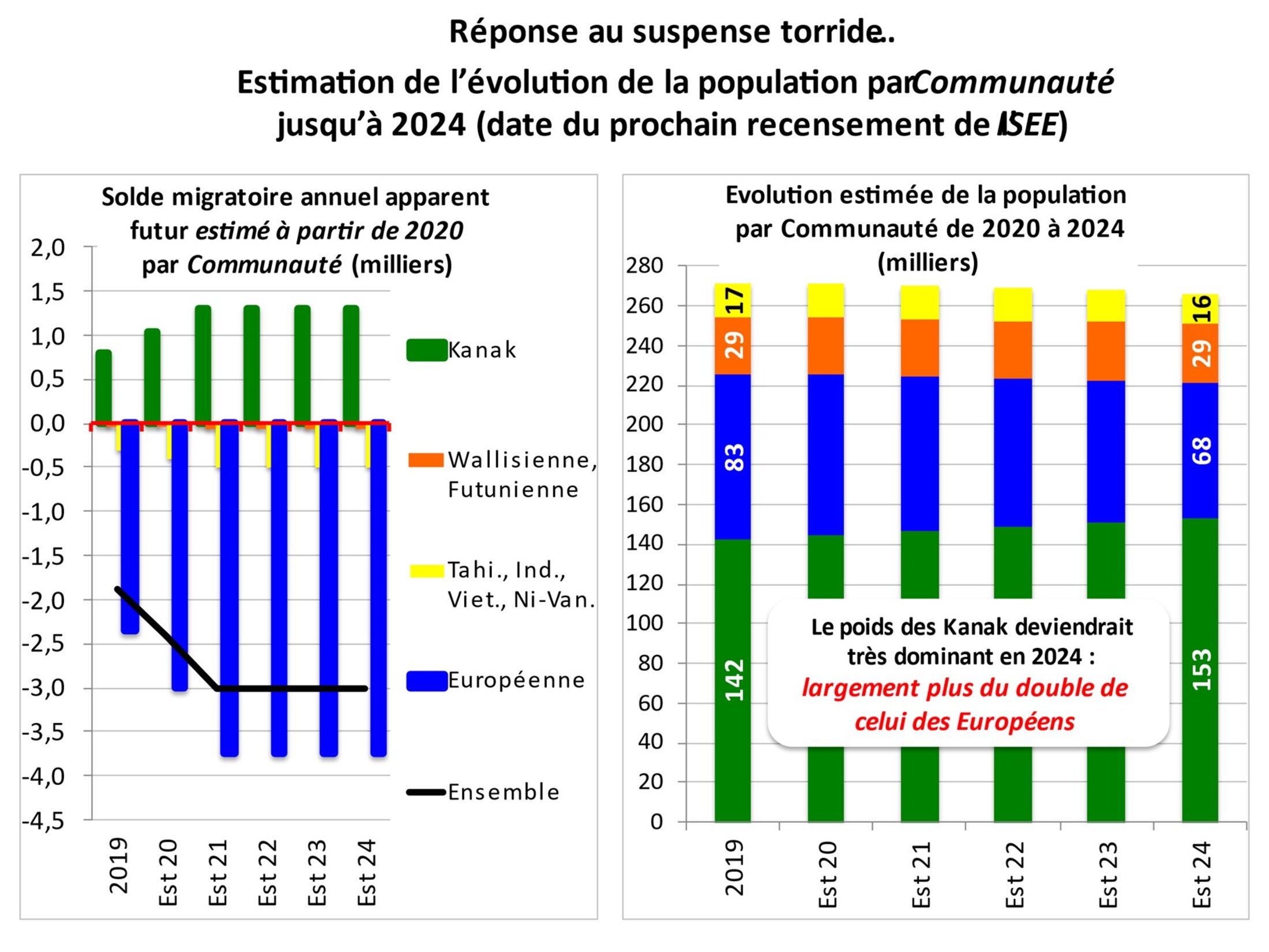On peut ainsi répartir le solde migratoire négatif global et approcher l’évolution probable de la population par communauté. Le résultat est frappant ; on comprend mieux pourquoi l’ISEE ne s’y est pas hasardé : c’est politiquement très gênant compte tenu du blocage actuel des négociations sur l’avenir institutionnel et la sortie des Accords de Matignon-Oudinot de 1988 et de Nouméa de 1998, la date butoir d’éventuels nouveaux accords étant justement 2024. Les Kanak deviendraient largement majoritaires au niveau du pays en 2024, avec 58 % contre 25 % pour les Européens : plus de deux fois plus. Si cette hypothèse pessimiste pour les tenants de la Calédonie française est risquée, celle d’un rapport 55-28 ou même 53-30 suffirait à émouvoir les loyalistes et à réjouir les indépendantistes…
