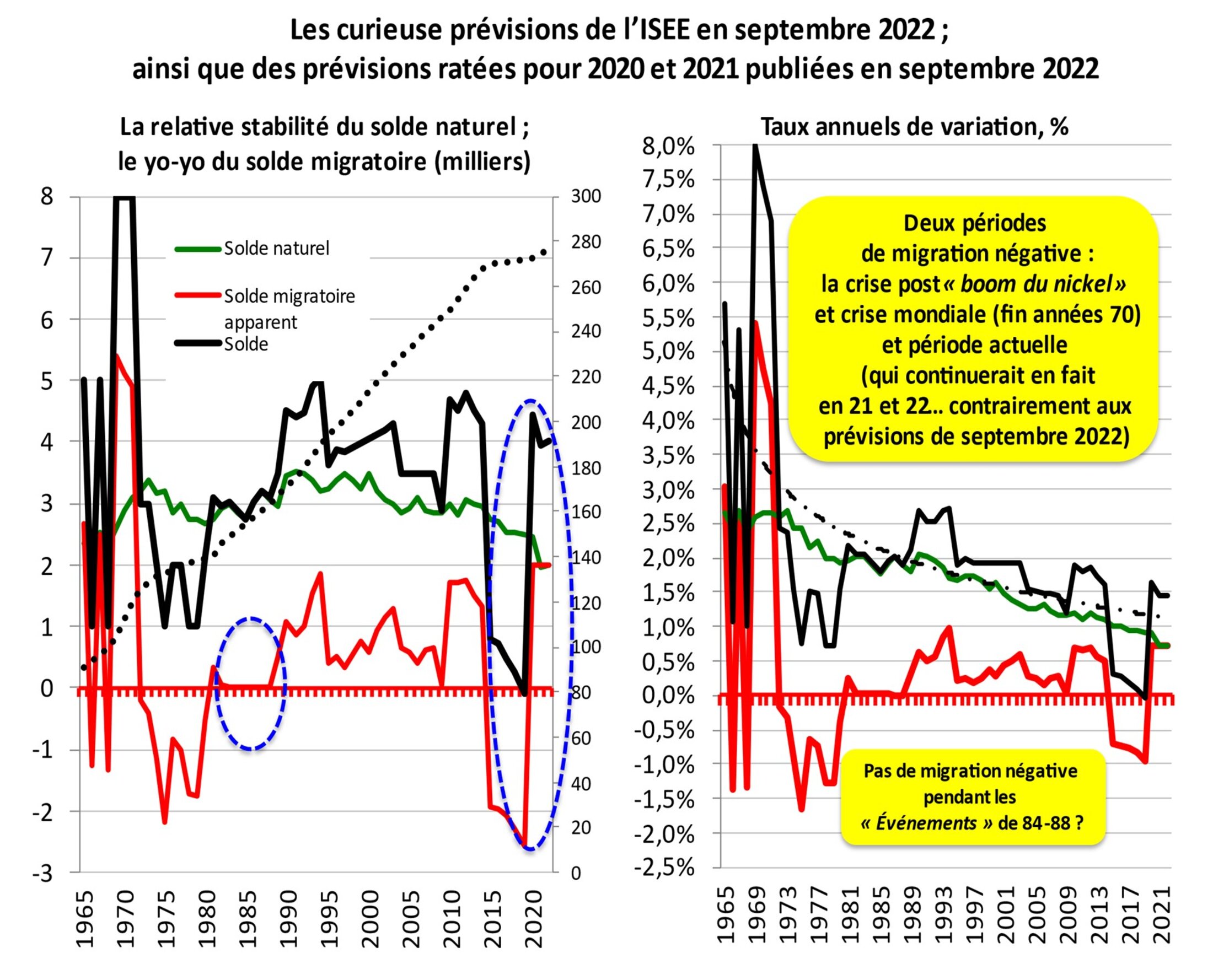 On peut néanmoins s’interroger sur la méthode employée par l’ISEE : il continue d’évaluer la migration externe nette actuelle à partir du modèle tiré de la période 2014-2019 pour les sorties, les entrées étant connues par les arrivées à l’aéroport international de La Tontouta. Mais rien ne dit que les flux de départ continuent sur le même rythme après 2019 ; l’hypothèse de l’ISEE ne semble choquer personne, même pas certains loyalistes qui pensent que la ruée vers l’or va recommencer, surtout après les trois référendums.