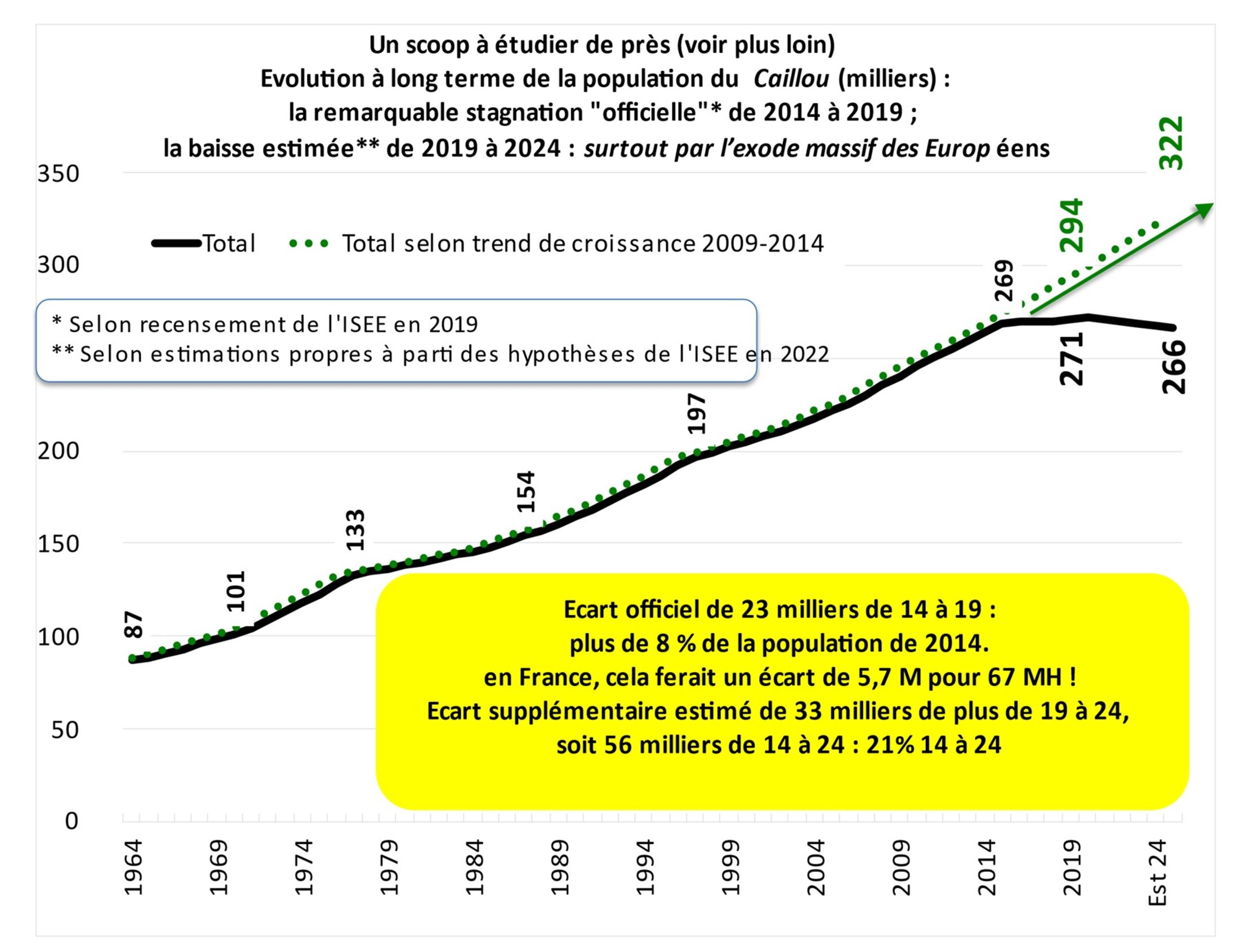 La population de Nouvelle-Calédonie serait maintenant, toujours d’après l’ISEE : en quasi-stagnation certaine pendant 5 ans à partir de 2014, selon le dernier recensement de 2019 ; en baisse probable de 2019 à aujourd’hui.