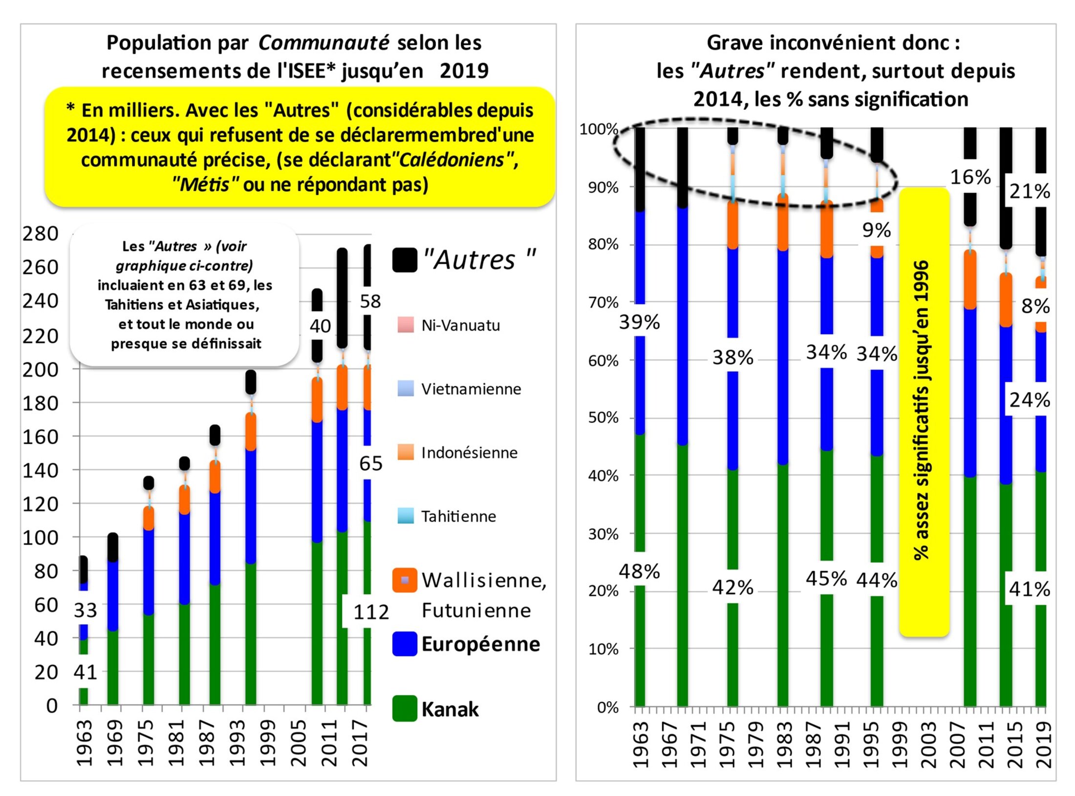 L’un de mes profs nous faisait remarquer, il y a bien longtemps, que les ratios (un pourcentage significatif[20]) : « C’est comme les bikinis : ça donne des idées, mais ça cache l’essentiel ». Ceux de l’ISEE sur la répartition de la population par ethnie sont en plein dans le mille ; et en plus ils ne présentent plus, depuis 2009, aucune relation avec la réalité : les Kanak sont-ils minoritaires en 2019 (ratio brut) ou majoritaires (ratio corrigé, même au doigt mouillé, mais pas tant que ça).