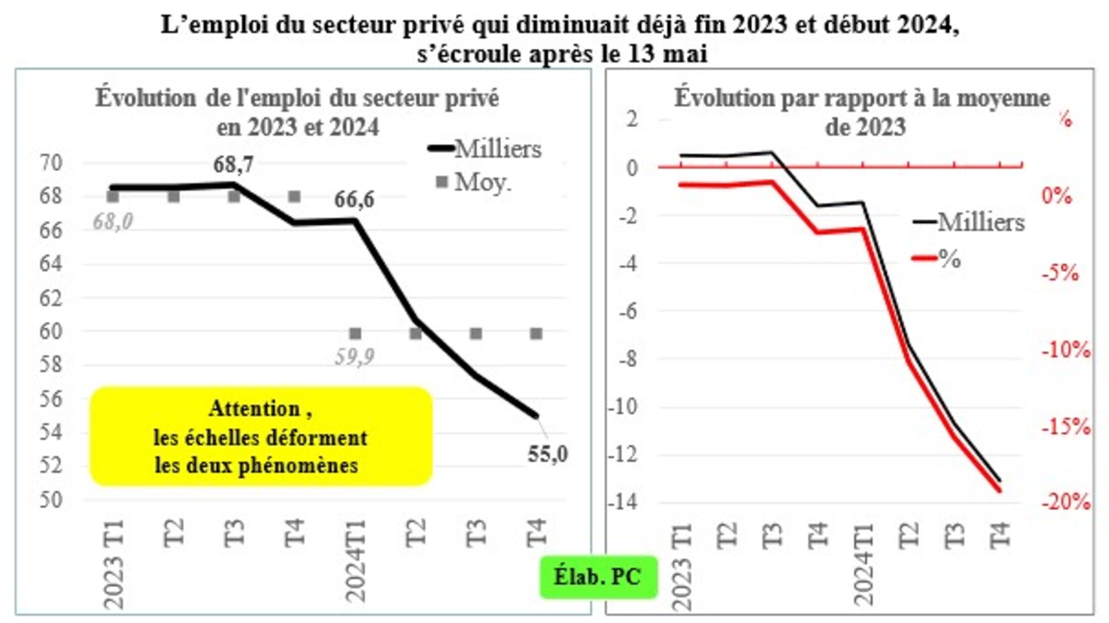 Il n’y a pas que l’emploi du secteur privé qui intéresse cet institut de statistiques et d’études économiques du Caillou. Mais sa chute est impressionnante et est due en quasi-totalité aux émeutes de mai, même si l’emploi se détériorait depuis 2023 : en gros – 20 % par rapport à la moyenne de 2023 (près de 12 milliers de moins que les 68 milliers de l’année précédente).