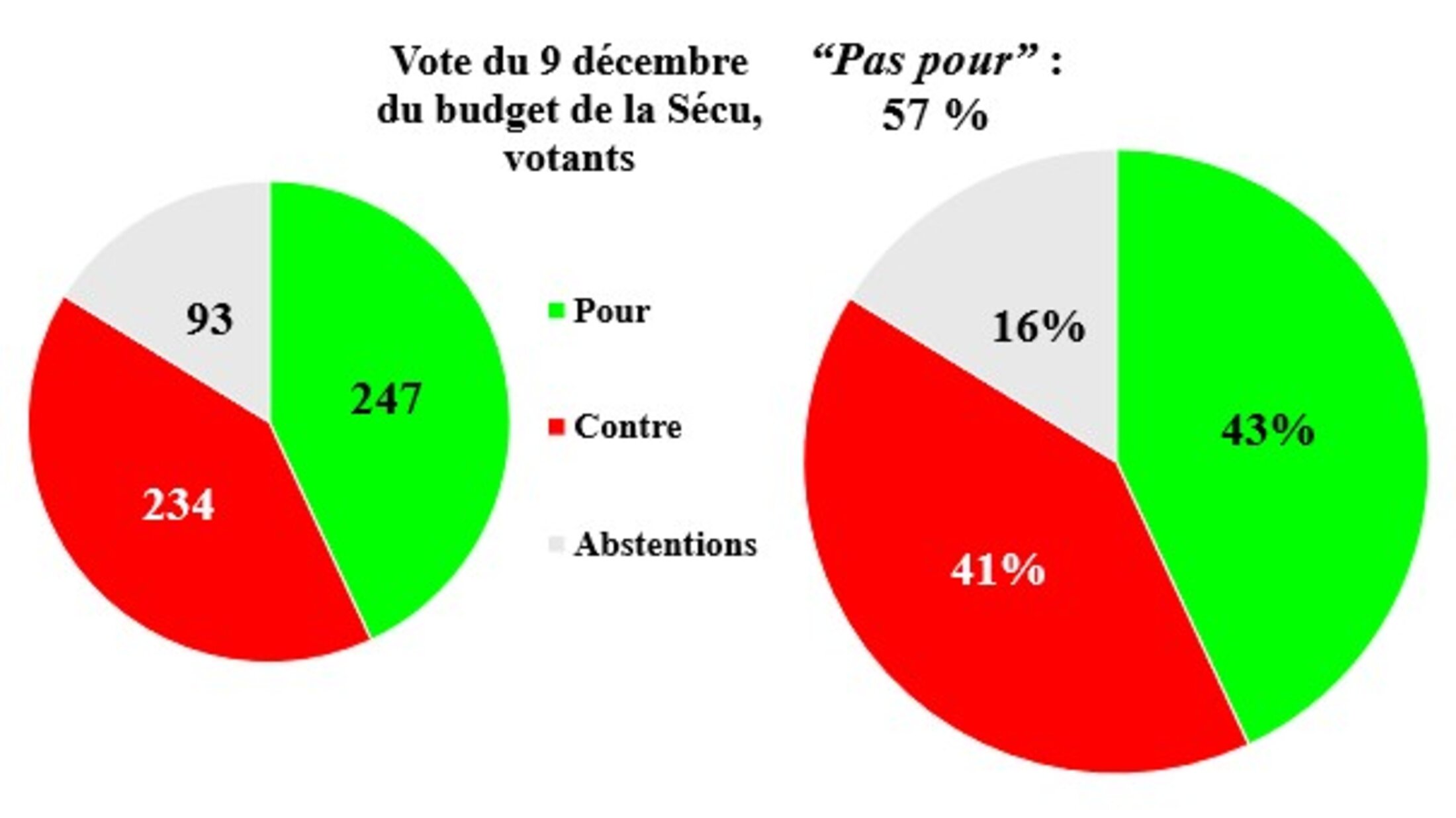 « Le texte, dans lequel figure notamment la suspension de la réforme des retraites, va de nouveau être examiné par le Sénat, mais sa version finale devrait ressembler à celle adoptée par les députés. […] Une victoire pour Sébastien Lecornu. Le projet de budget de la Sécurité sociale (PLFSS) a été adopté à l’issue d’une nouvelle lecture à l’Assemblée nationale, mardi 9 décembre, à une très courte majorité, grâce notamment au soutien du Parti socialiste. Dans le détail, 247 députés ont voté pour, 234 ont voté contre et 93 se sont abstenus. Les socialistes ont obtenu plusieurs gages dans ce PLFSS, dont la suspension de la réforme des retraites et l’abandon du doublement des franchises médicales ».