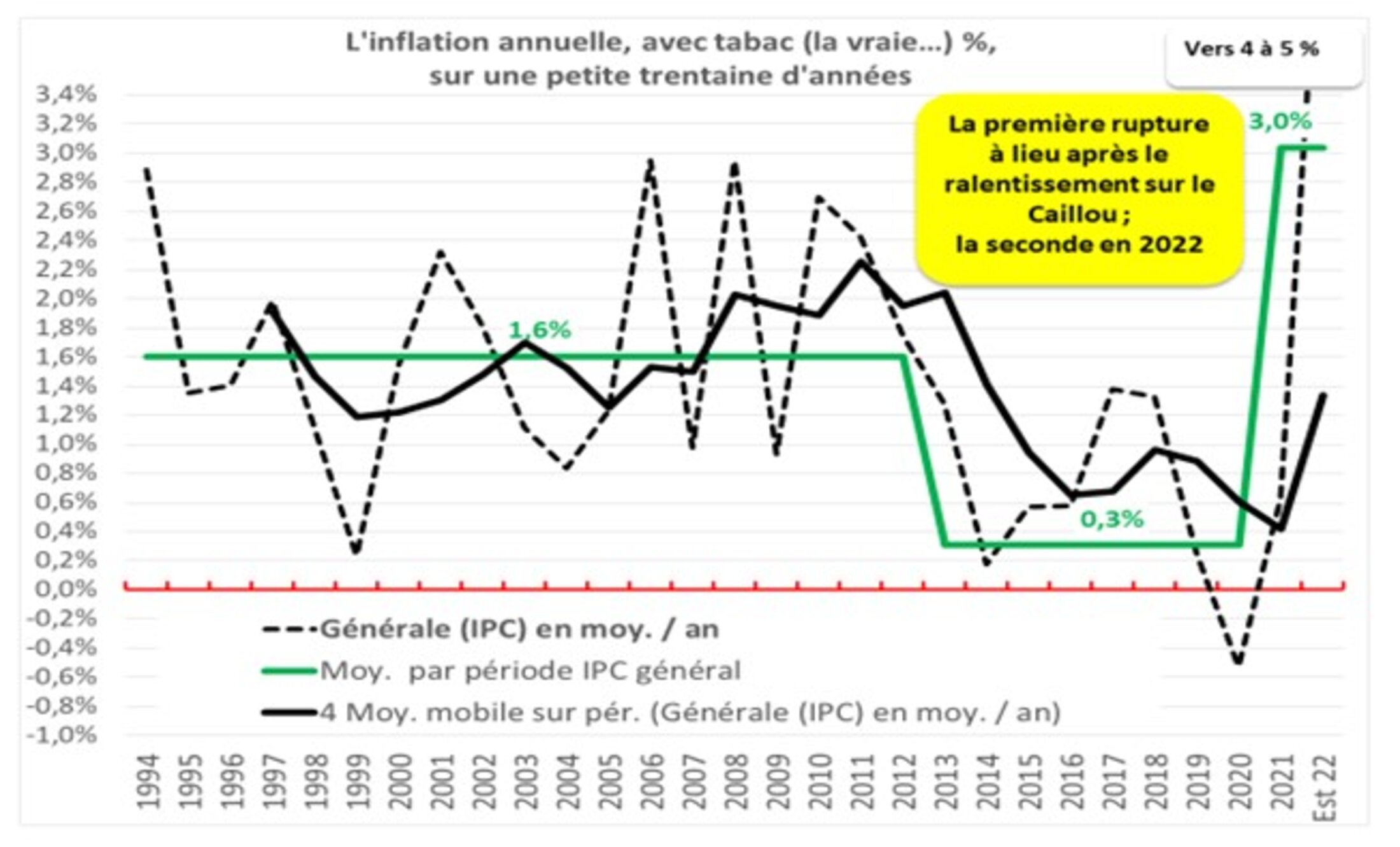 On peut donc maintenant aller un peu plus loin et aussi préciser les évolutions passées. Un peu avant la crise de 2008, l’inflation sur le Caillou rebondissait en peu ; notre présentation de 2018 avait zappé ce phénomène ; cependant, le trou qui suivit sautait déjà aux yeux en analyse par mois et semblait s’arrêter en 2014-2015. C’était vrai, mais pas du tout traduit par l’analyse annuelle où la désinflation continuait. Elle a en effet continué, mais avec un net rebond en 2018 que nous ne pouvions évidemment pas anticiper, rebond cassé bien avant la crise de la Covid, dès 2019, mais évidemment boostée par cette dernière, notamment par la baisse des coûts de l’énergie (dont la baisse des cours du pétrole brut).
