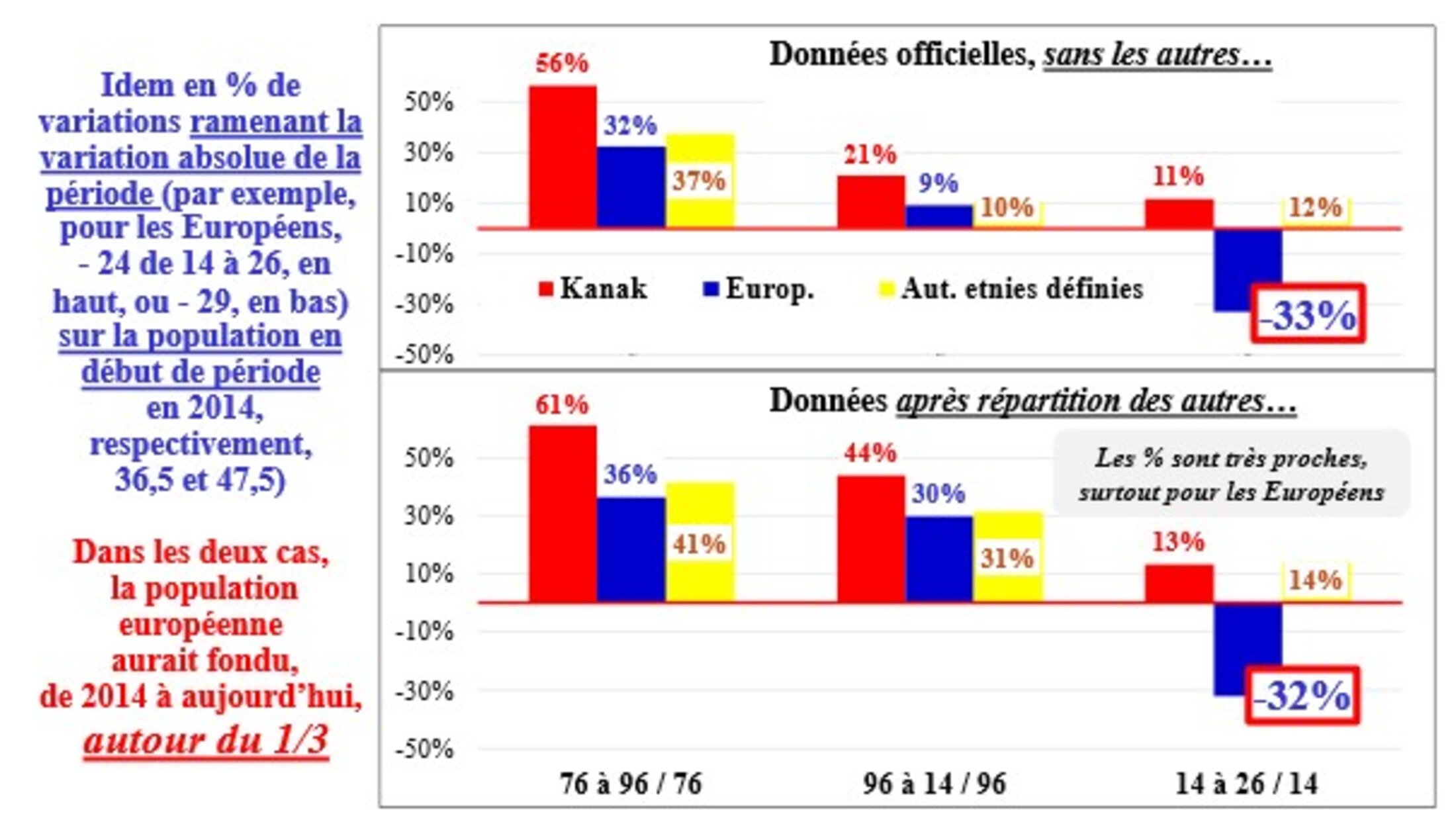 Ainsi, en déduire des pourcentages (souvent donnés, sans doute pour ne pas effrayer, par exemple et répétés à l’envi : 41 % de Kanak et 24 % d’européens, dernières données officielles de 2019) n’a ni queue ni tête ! Je propose donc depuis de lustres, et la présente aussi ci-dessous, une solution un peu ou beaucoup pifométrique… Les Kanak étaient ainsi, avec cette analyse, proche de 50 % en 2014 (49 %...) et seraient nettement plus en 2025 et 2026.