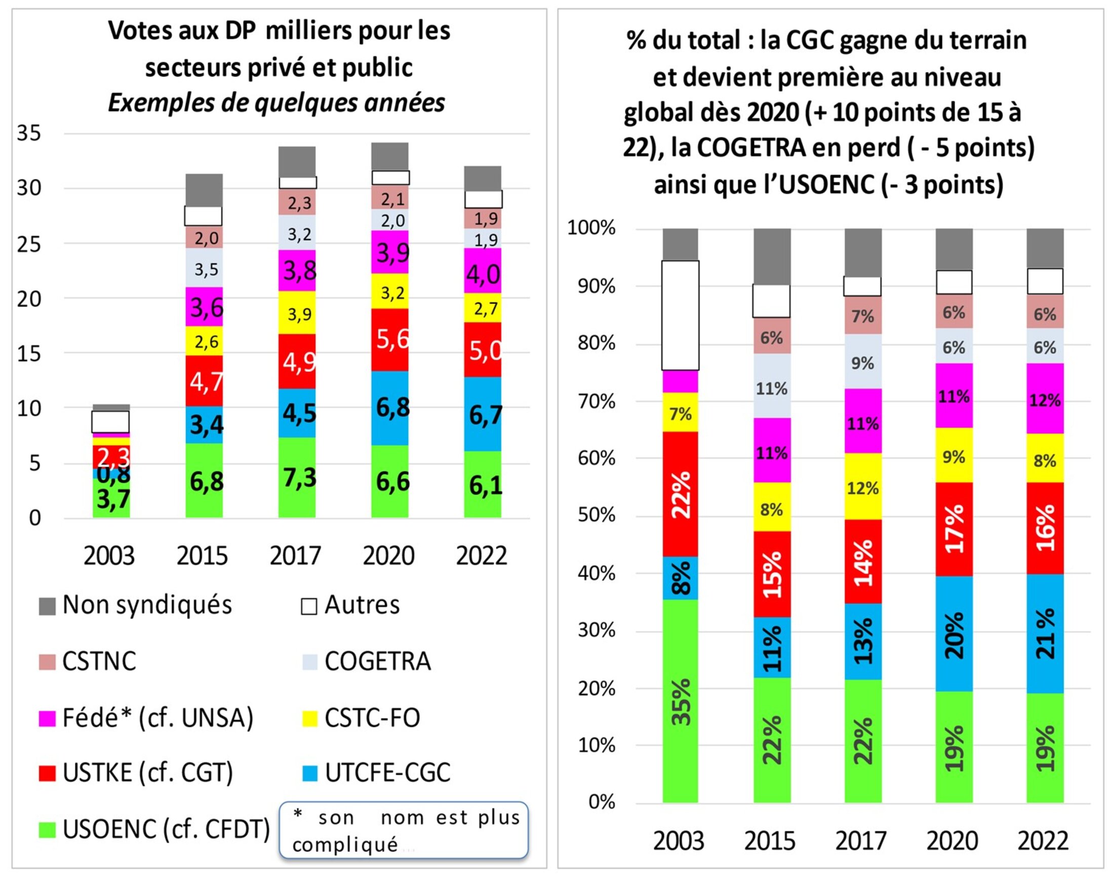 Au niveau global[8] (secteur privé et secteur public), l’USOENC (liée à la CFDT) premier syndicat, et de loin, au milieu des années 2010, dégringole ; la CGC perce à partir de 2020 et remplace l’USOENC à la première place en 2022 (évolution due à des transfuges de petits syndicats ; probablement, mais cela reste peu clair, en intégrant des syndicats issus de la COGETRA, et le développement vers les salariés non-cadres ou agents de maîtrise) et non pas à une croissance organique. ; l’USTKE perce également à la même date et rejoint l’USOENC. Voilà pour les trais grands. Pour les quatre petits, la Fédé se maintient, FO qui augmentait son score s’écroule depuis 2020 ; la COGETRA (Confédération générale des travailleurs de Nouvelle-Calédonie, sans équivalent en Métropole) COGETRA, déjà pas bien grosse et créée par une fusion de plusieurs syndicats pour devenir représentatif, s’écroule et flirte maintenant avec la non-représentativité depuis 2020, comme la CSTNC qui bouge cependant peu.