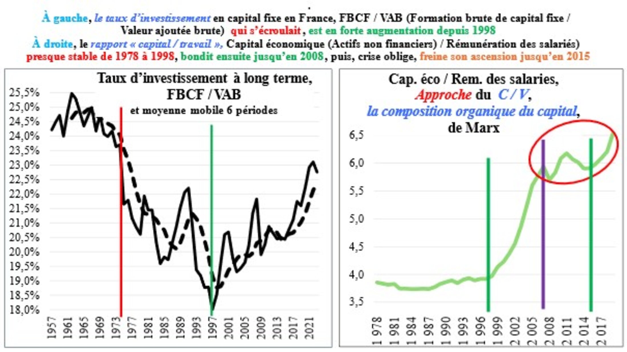 Mais, insistons, ce n’est pas la baisse du taux de marge nette qui est la principale explication de la chute du taux de profit économique : c’est surtout la hausse de ce qui ressemble à la composition organique du capital de Marx indiquée plus haut.
