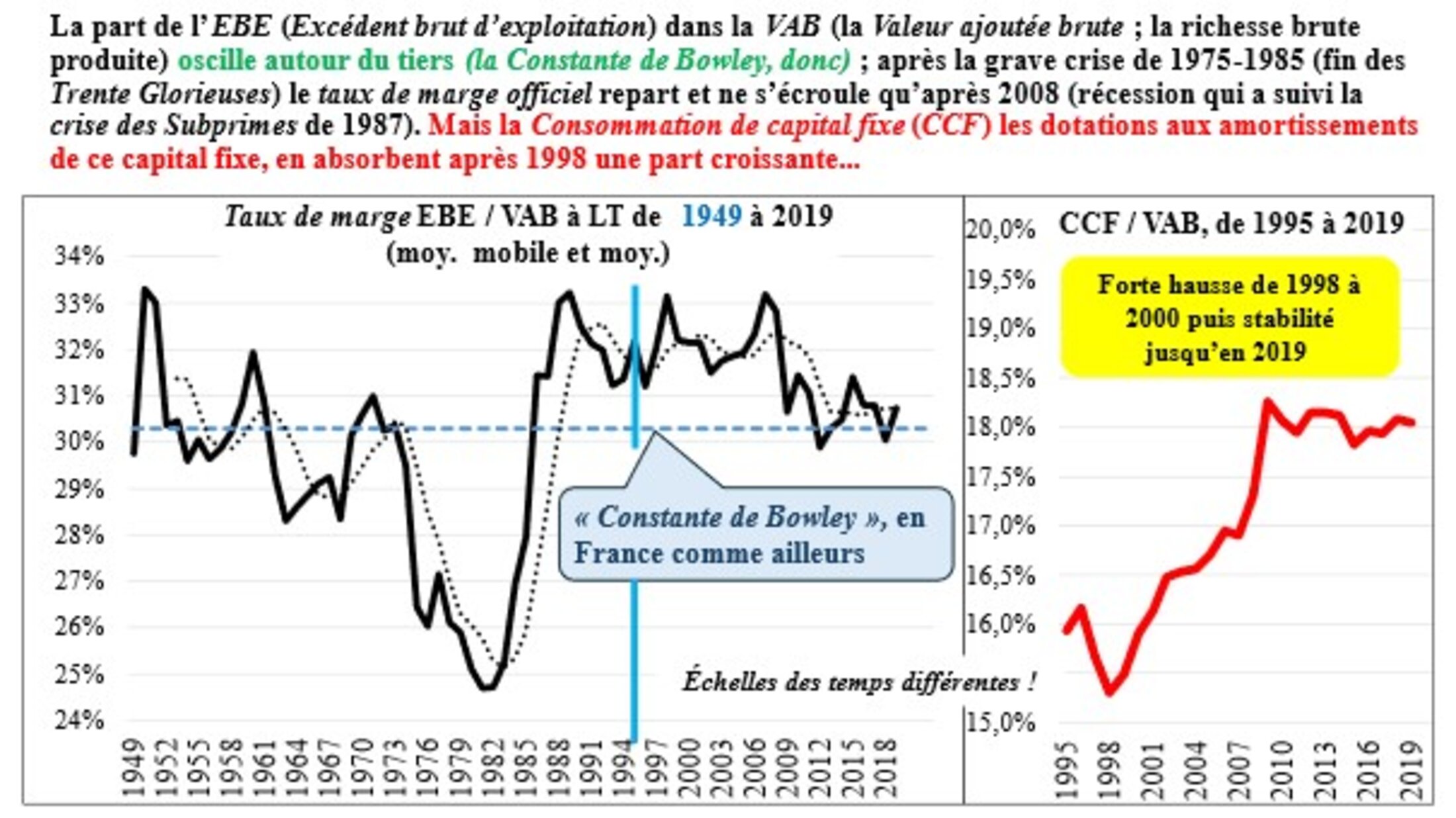 L’érosion du taux de marge officiel n’est donc pas évidente ; sa diminution peut ne paraître que conjoncturelle et simple conséquence de la crise économique déclenchée en 2007-2008 ; d’autant plus que la chute cesse après 2012 ; cependant à un niveau bas, mais attendons... Donc, pas de baisse du taux de profitabilité officiel : les profits se goinfrent, mais leur part dans la VAB reste en gros constante, c’est une super constante de Bowley ! Et tout le monde s’y laisse prendre...