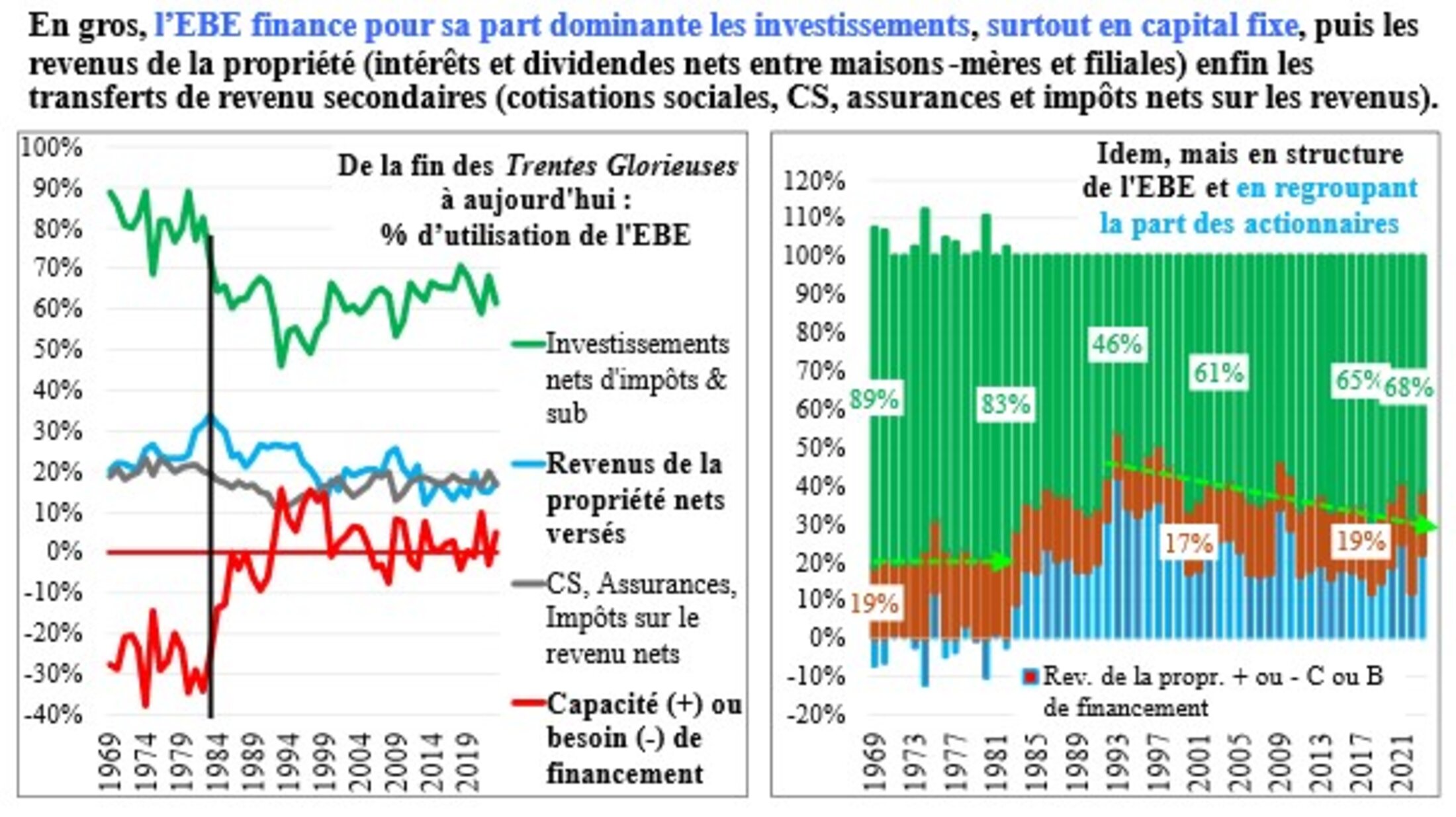 On peut être plus précis que ce rapport et donner un horizon plus large à la question de l’investissement. La part de l’investissement financé par l’EBE tourne depuis le début du XXe siècle autour de 60 à 70 %, celle des intérêts et dividendes rémunérant les capitaux autour de 20 % (un peu plus si l’on tient compte de la capacité d’autofinancement conservée par les Sociétés non financières ; négatives avant la fin des années 1980 ! Fut oubliée, dans le débat lancé par Sarkozy, la répartition secondaire des revenus, prélèvements obligatoires en impôts et cotisations sociales et primes moins indemnités d’assurance et divers (10 à 20 %)...