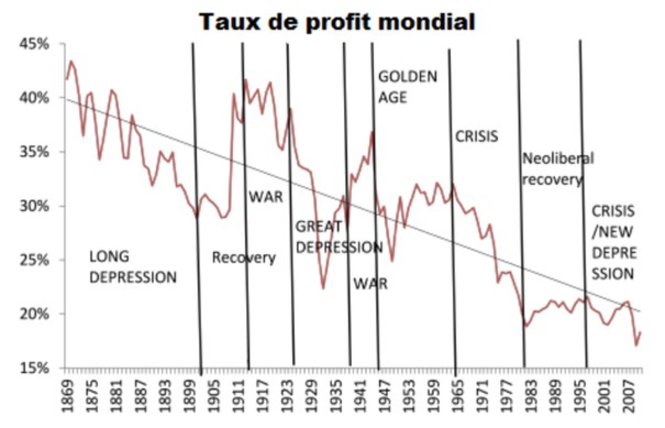 Et même que le taux de profit, selon certains, s’écroulerait tendanciellement (voir le graphique ci-dessous tiré de Wikirouge) dans le monde (mais avec des cycles) depuis 1869... Il serait cependant stable mais heurtée depuis le début des années 1980 après sa forte chute qui a suivi les Trente Glorieuses (le « Golden Age ») commencée ici en 1965 et non dix ans plus tard (?).
