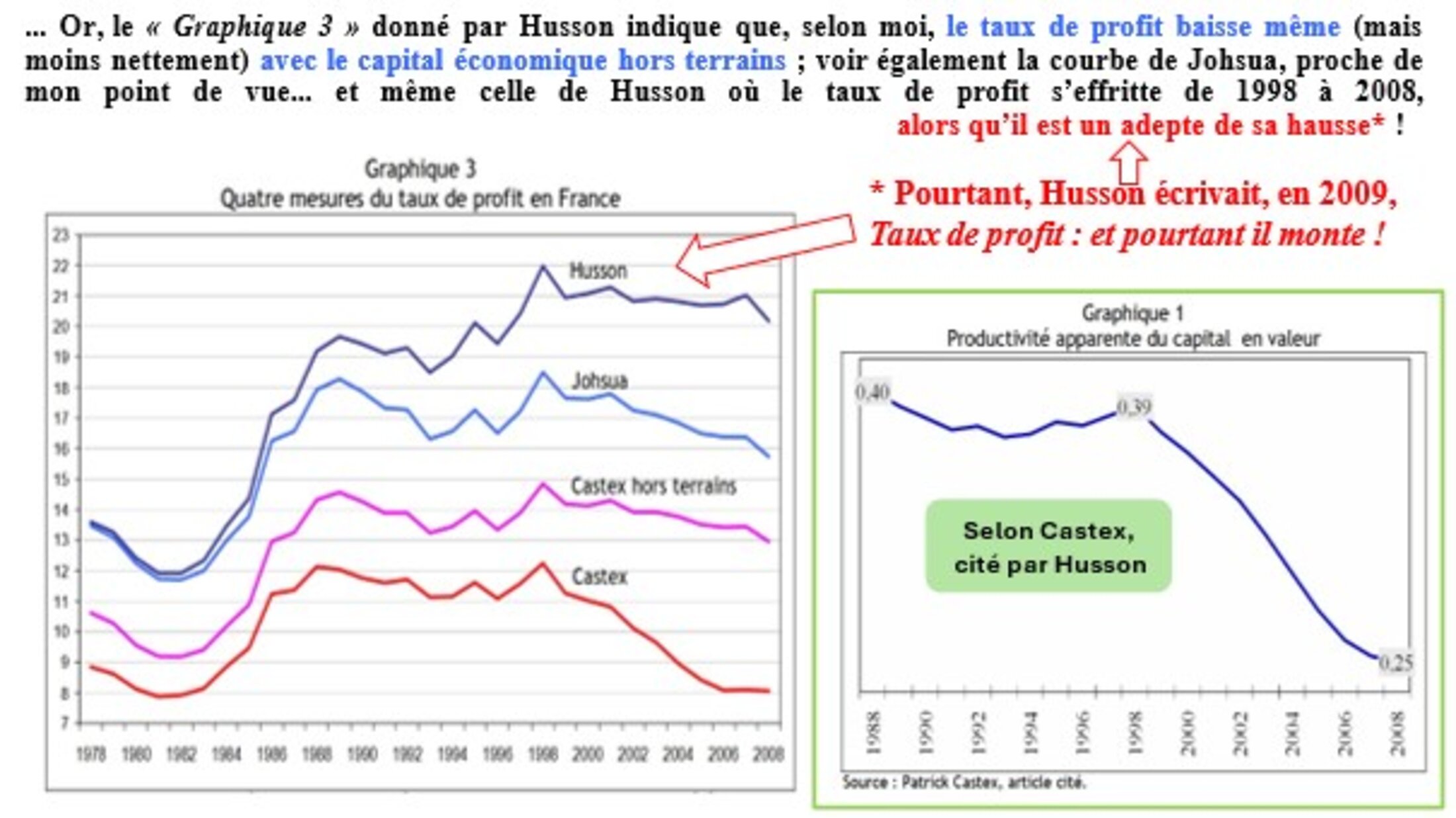 En décembre 2009, il notait déjà dans sa Note hussonet n° 9, Taux de profit : et pourtant il monte ! la « ... controverse sur l’évolution du taux de profit s’est ouverte entre économistes marxistes. Certains trouvent que le taux de profit a enregistré une hausse tendancielle depuis le début des années 1980, d’autres qu’il a au contraire stagné voire baissé tendanciellement ». Voir :
