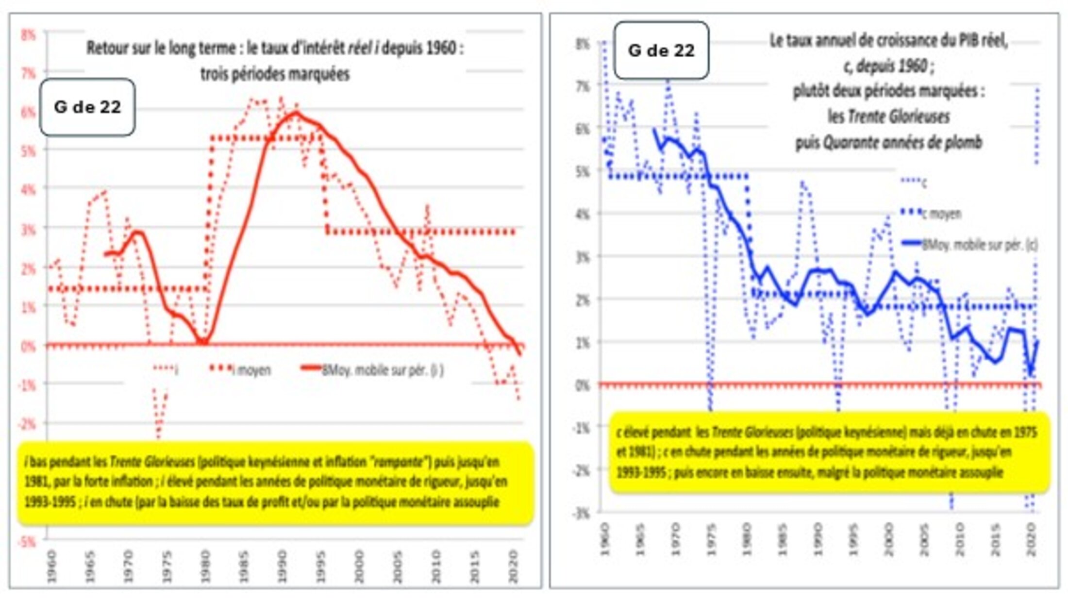 Précisons d’abord son évolution à long terme avant de voir son intérêt. Je renvoie à mes vieux graphiques de 2022, l’E-ic[22] positif y est largement dominant, les Trente Glorieuses apparaissant comme une exception à la règle avec des taux d’intérêt réels très faibles (déflatés par l’indice des prix à la consommation, ce qui biaisait peut-être l’approche en les minorant) et des taux réels de croissance économique (du PIB en volume) digne des contes de fée...