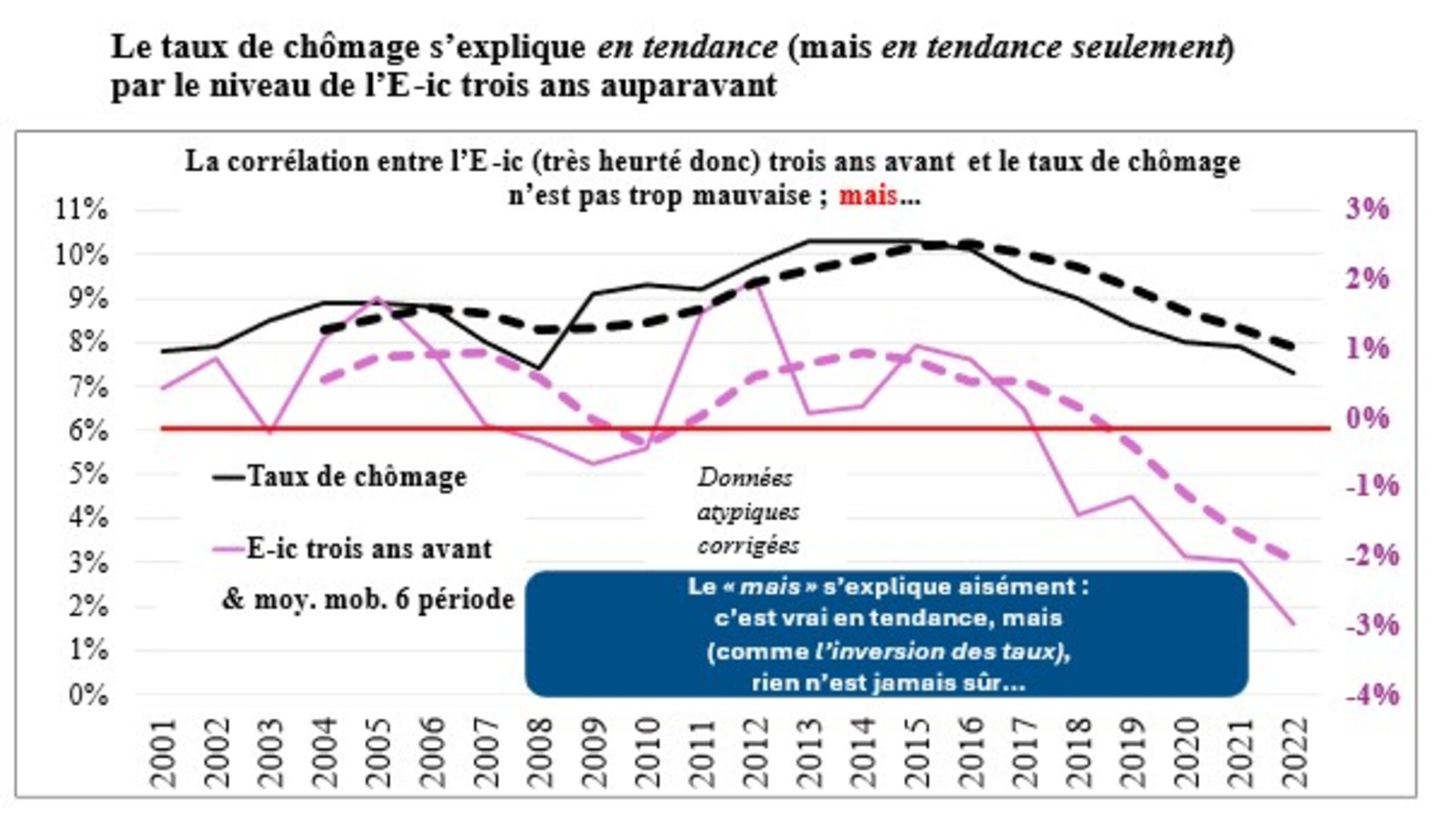 Enfin, pour finir, le principal intérêt de l’E-ic pourrait être sa faculté de prévision de l’activité économique. Ce serait trop simple... D’abord parce que corrélation (d’ailleurs pas trop géniale : autour de 50 % de coefficient de corrélation) n’est pas raison (cependant la cause de l’E-ic ne peut pas être le taux de chômage trois ans après !) ; surtout par le caractère trop heurté de cet indicateur. Ce qui est en fait une banalité en tendance ne peut être un instrument de prévision ; pourquoi ? Un E-ic plus élevé que le taux de croissance peut certes évoquer, en termes keynésiens, un danger de récession et de chômage (surtout par l’intervention de la politique monétaire) ; mais la croissance peut être faible, par exemple en cas de difficulté conjoncturelle à l’exportation.