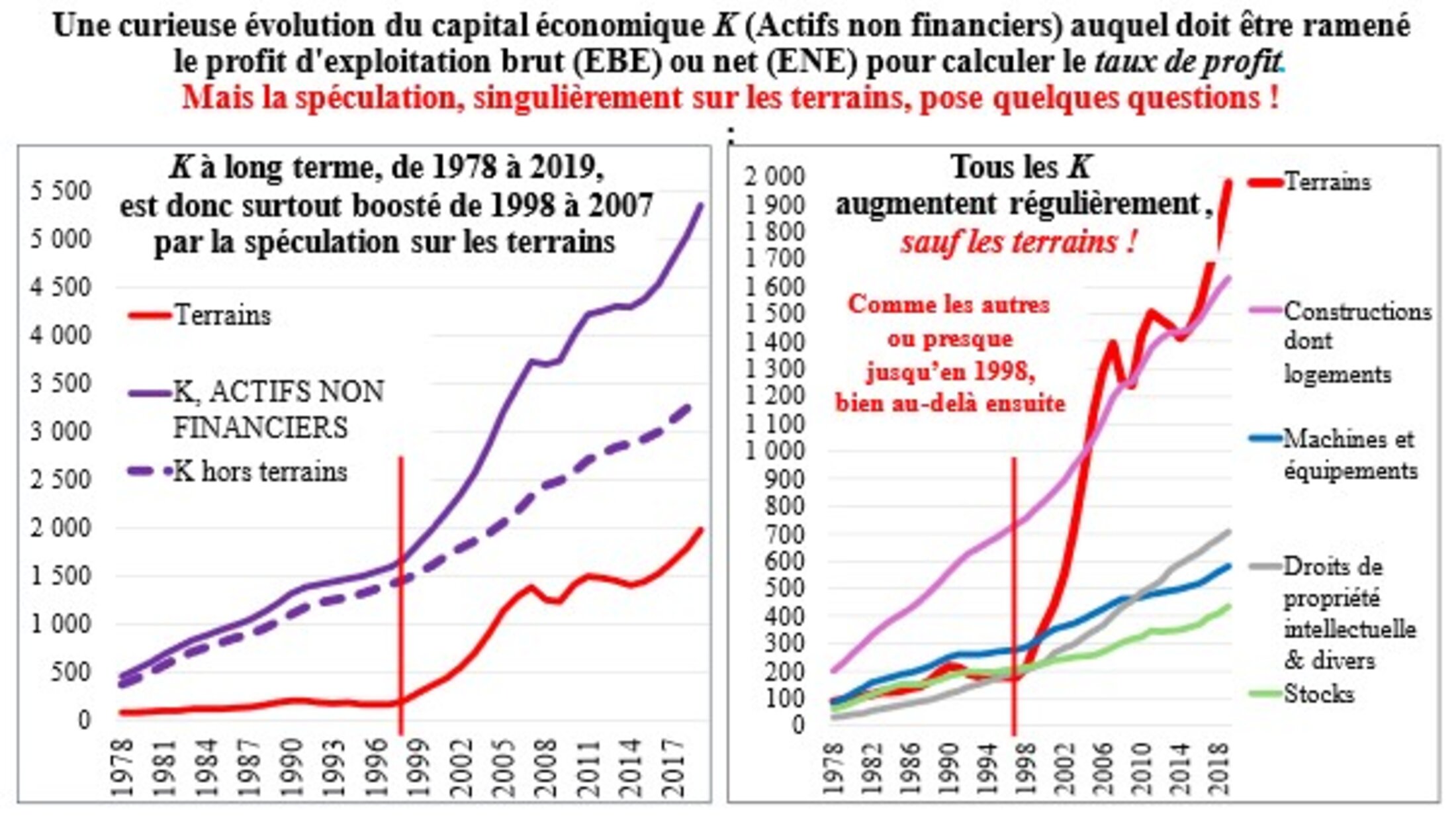 Prendre K avec terrains pour calculer les taux de profit économique va donc les diminuer mécaniquement pour les agents qui les ont achetés il y a longtemps au coût historique : cela diminue leur taux de profit apparent, mais ils bénéficient alors de plus-values latentes[14] ; pour les acquisitions, le coût historique est le prix actuel. Le taux de profit calculé ainsi pose en effet question, mais n’est pas l’horreur et l’erreur que certains lui vouent. On a aussi calculé les taux de profit sur les actifs non financiers hors terrains.