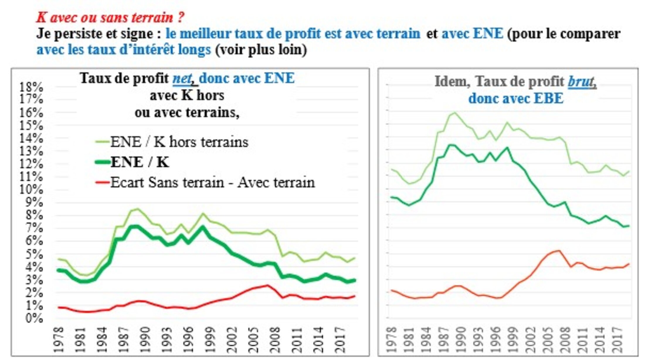 Bien sûr, le taux de profit est supérieur avec EBE / K ; mais les deux courbes sont en fait assez parallèles et la chute est du même ordre, quoiqu’un peu plus forte, relativement, avec le taux net. On laisse quelques secondes de suspense pour expliquer notre préférence du taux net ; et on reviendra un plus loin sur celle concernant la prise en compte des terrains dans K.