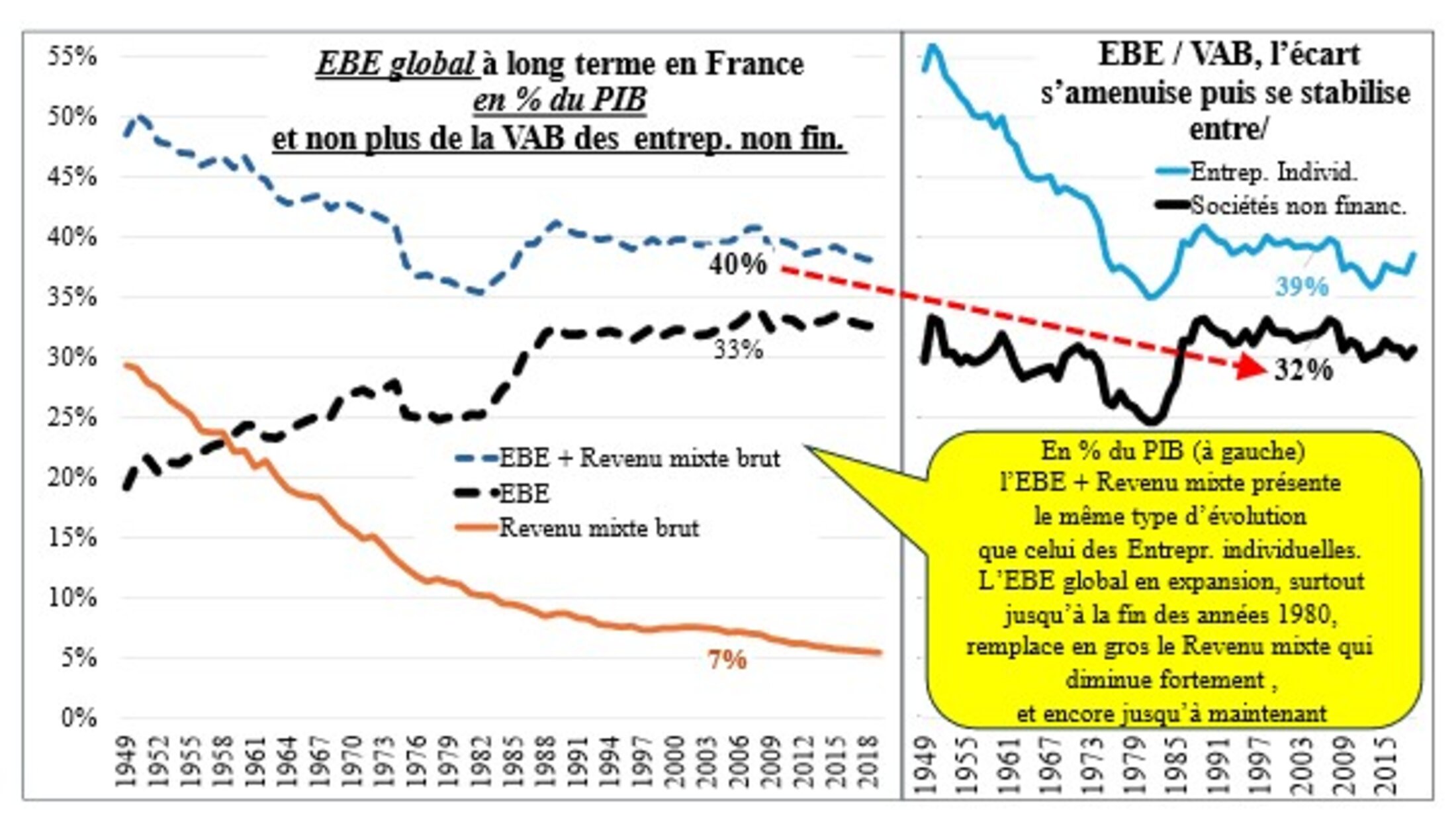Ces données étaient donc fausses, car soumises à au moins deux biais : d’une part, l’EBE calculé l’était avec les seuls salaires bruts fournis par l’ISEE, hors charges patronales (confusion très classique sur le Caillou…) ; d’autre part, la comparaison avec la Métropole s’effectuait non pas avec les seules Sociétés non financières, mais toutes les entreprises pour le Caillou ! Or, le taux de marge de ces Sociétés non financières est très inférieur à ceux des Entrepreneurs individuels, dans la mesure où l’EBE et revenu mixte inclut pour ces dernières la rémunération du travail des chefs de ces entreprises. On le précise ici avec quelques graphiques : bref, le taux (EBE + Revenu mixte) / PIB est bien plus élevé (autour de 40 % actuellement) que celui des seules Sociétés non financières (autour de 32 %).